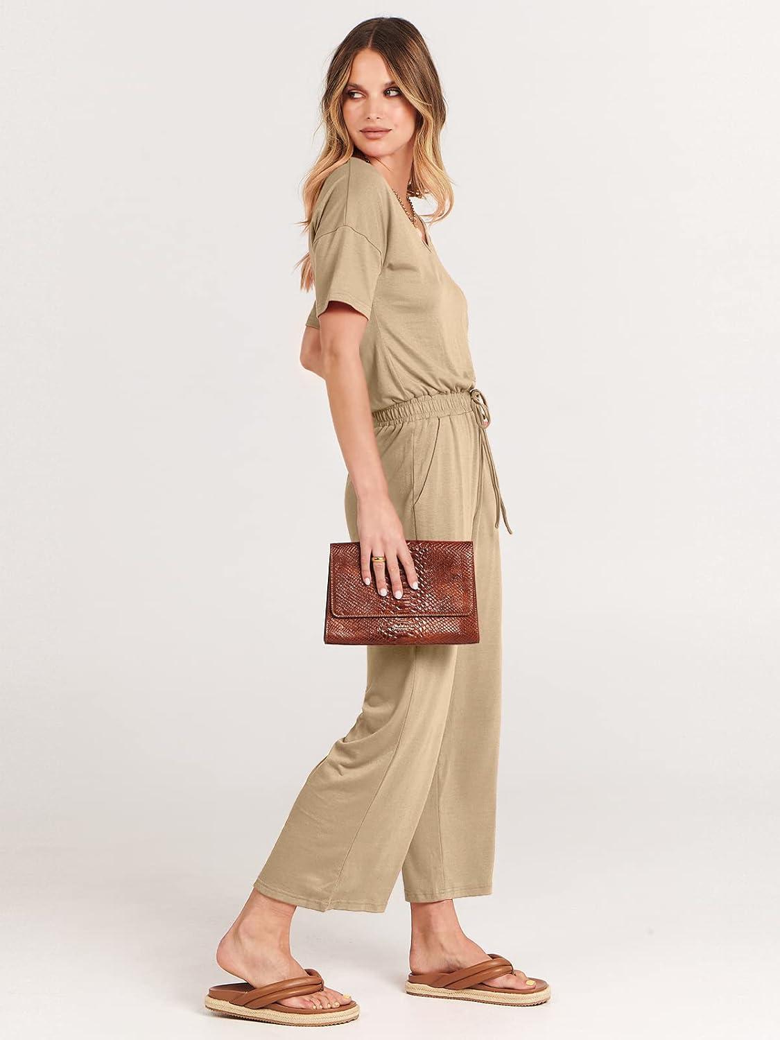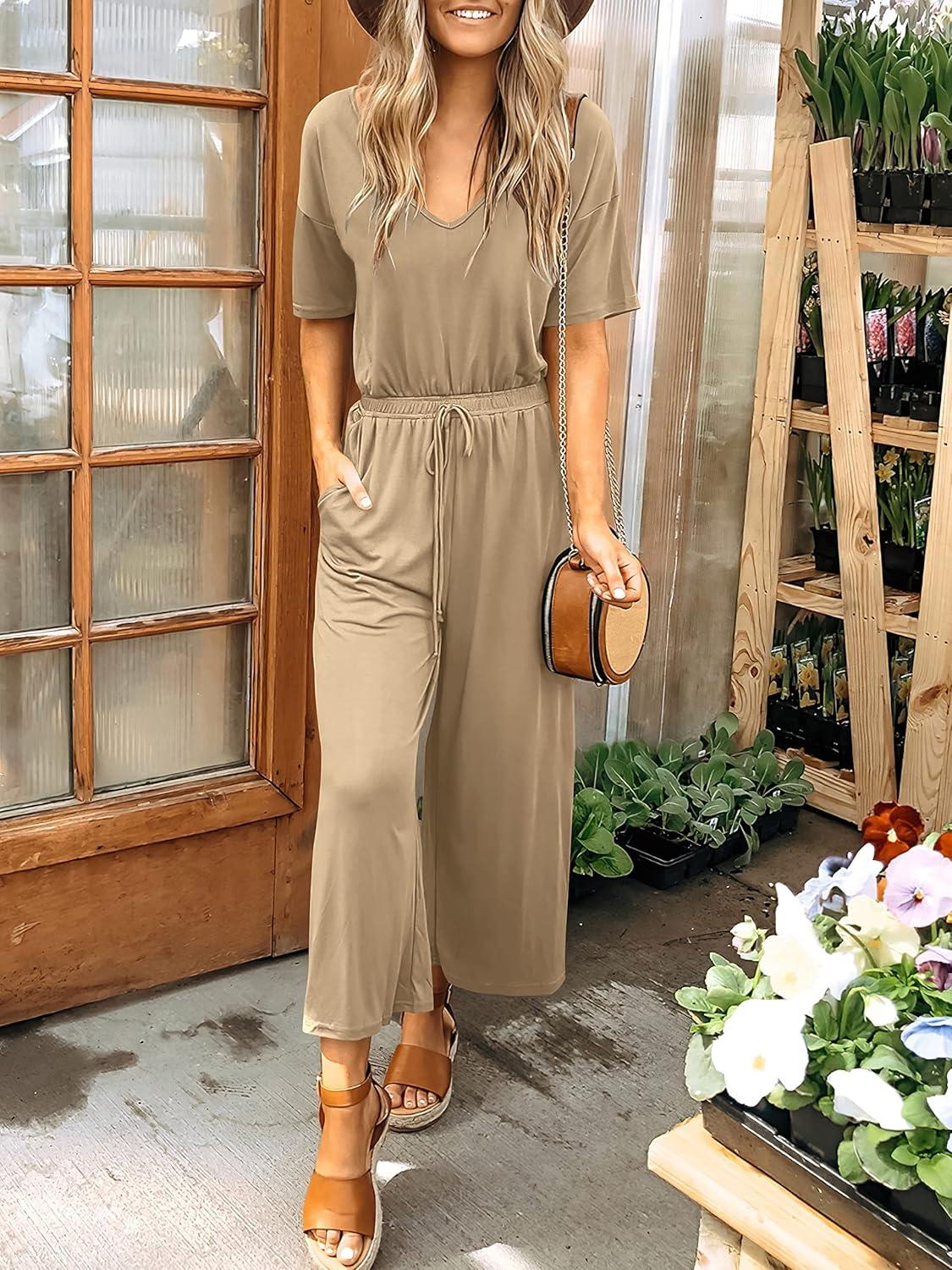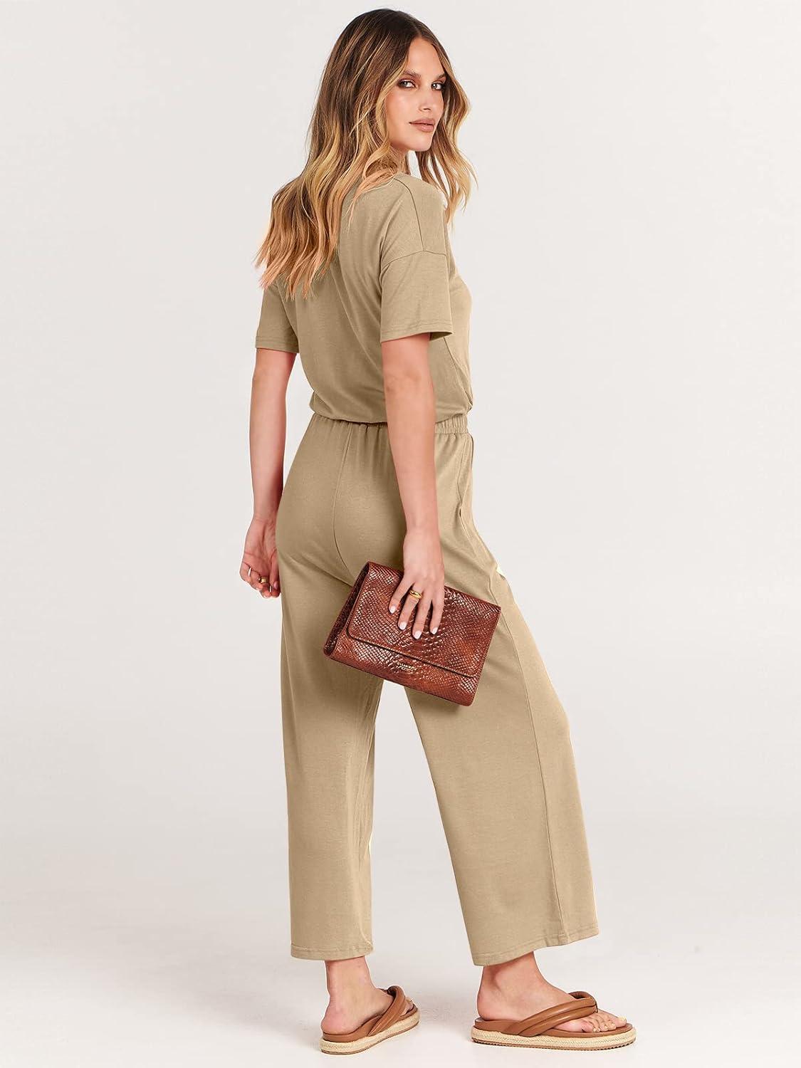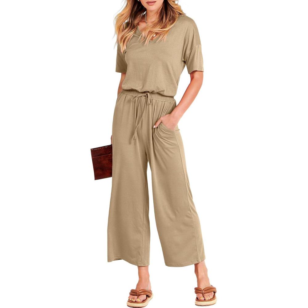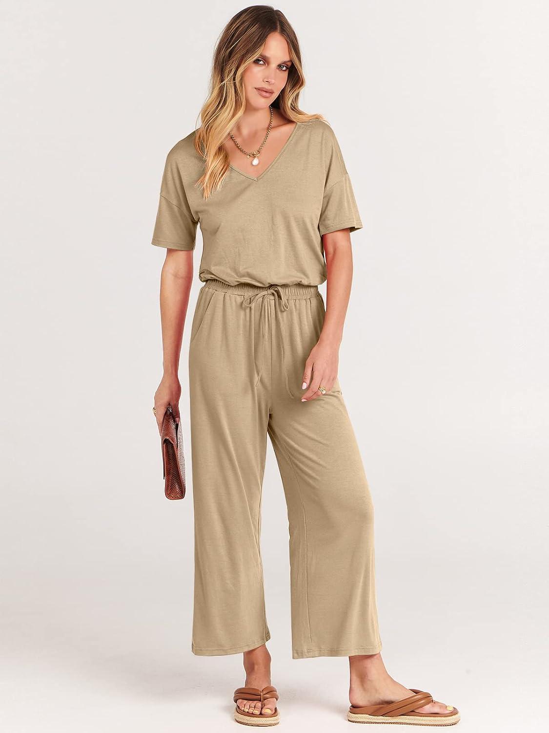 imageANRABESS Women Summer Casual Short Sleeve V Neck Elastic Waist Wide Leg Cropped Pants Jumpsuits Rompers with Pockets00khaki