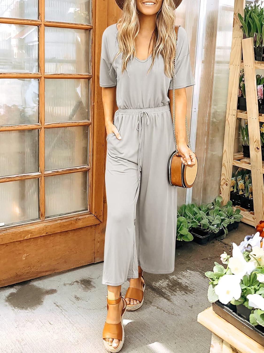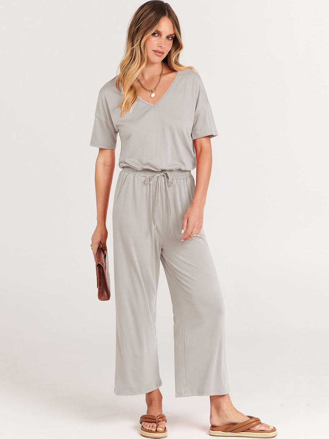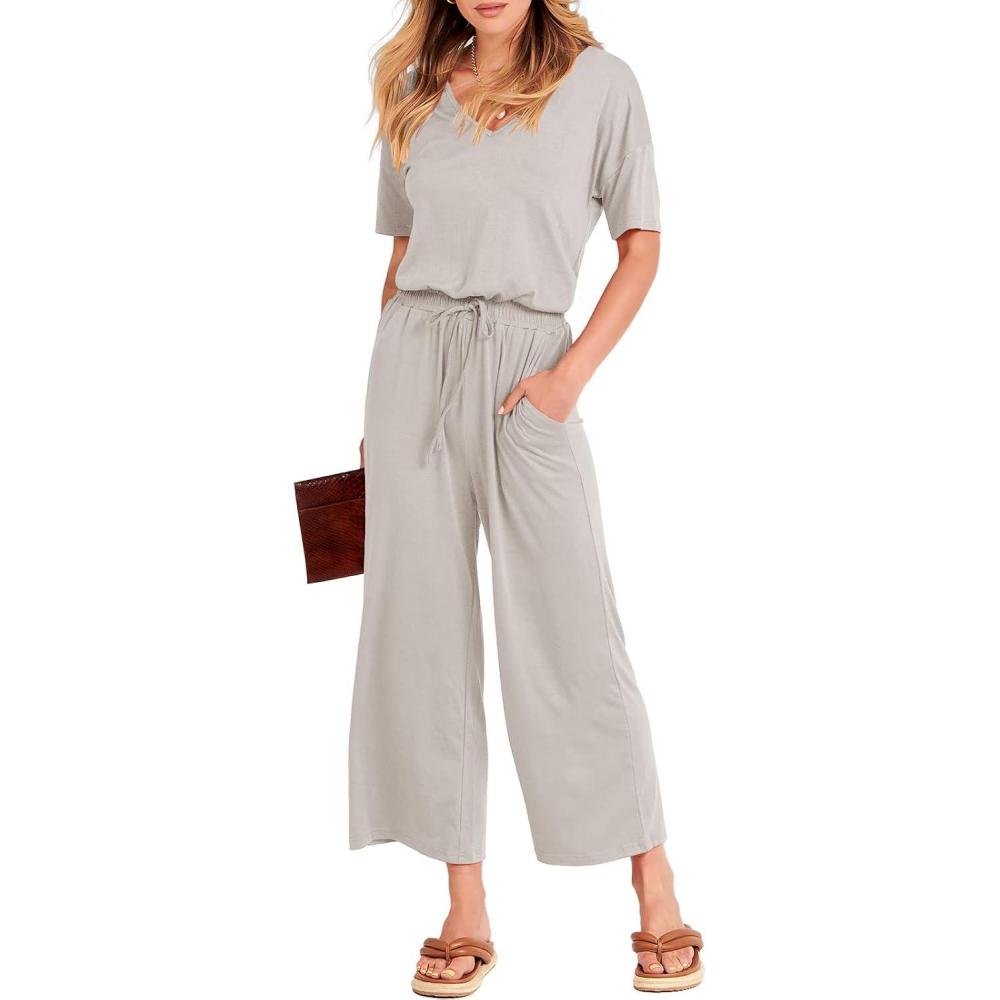 Get the ANRABESS Women Summer Casual Short Sleeve V Neck Elastic Waist Wide Leg Cropped Pants Jumpsuits Rompers with Pockets(02-light Gray) you want at a discounted price during our markdown sale event.