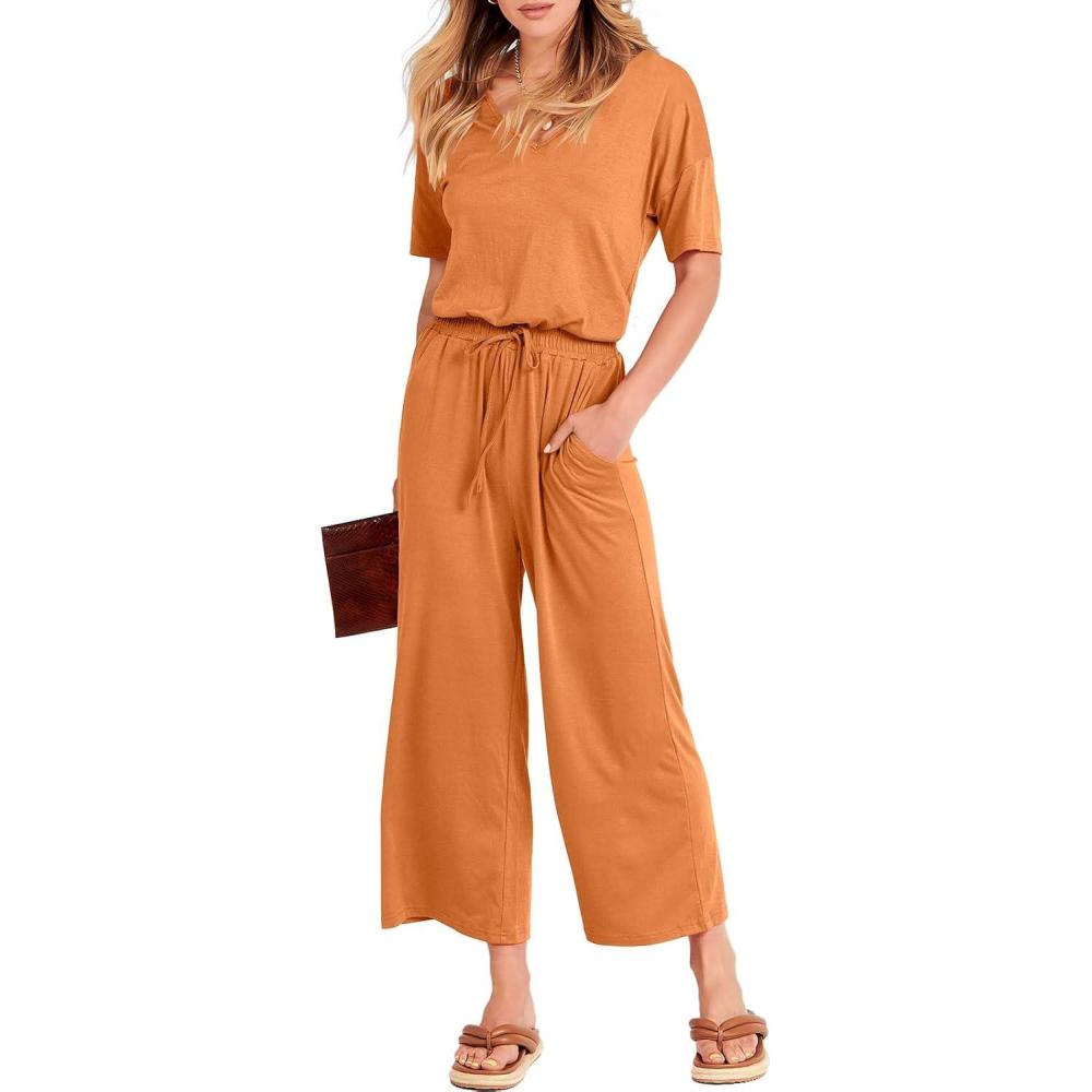 imageANRABESS Women Summer Casual Short Sleeve V Neck Elastic Waist Wide Leg Cropped Pants Jumpsuits Rompers with Pockets02orange