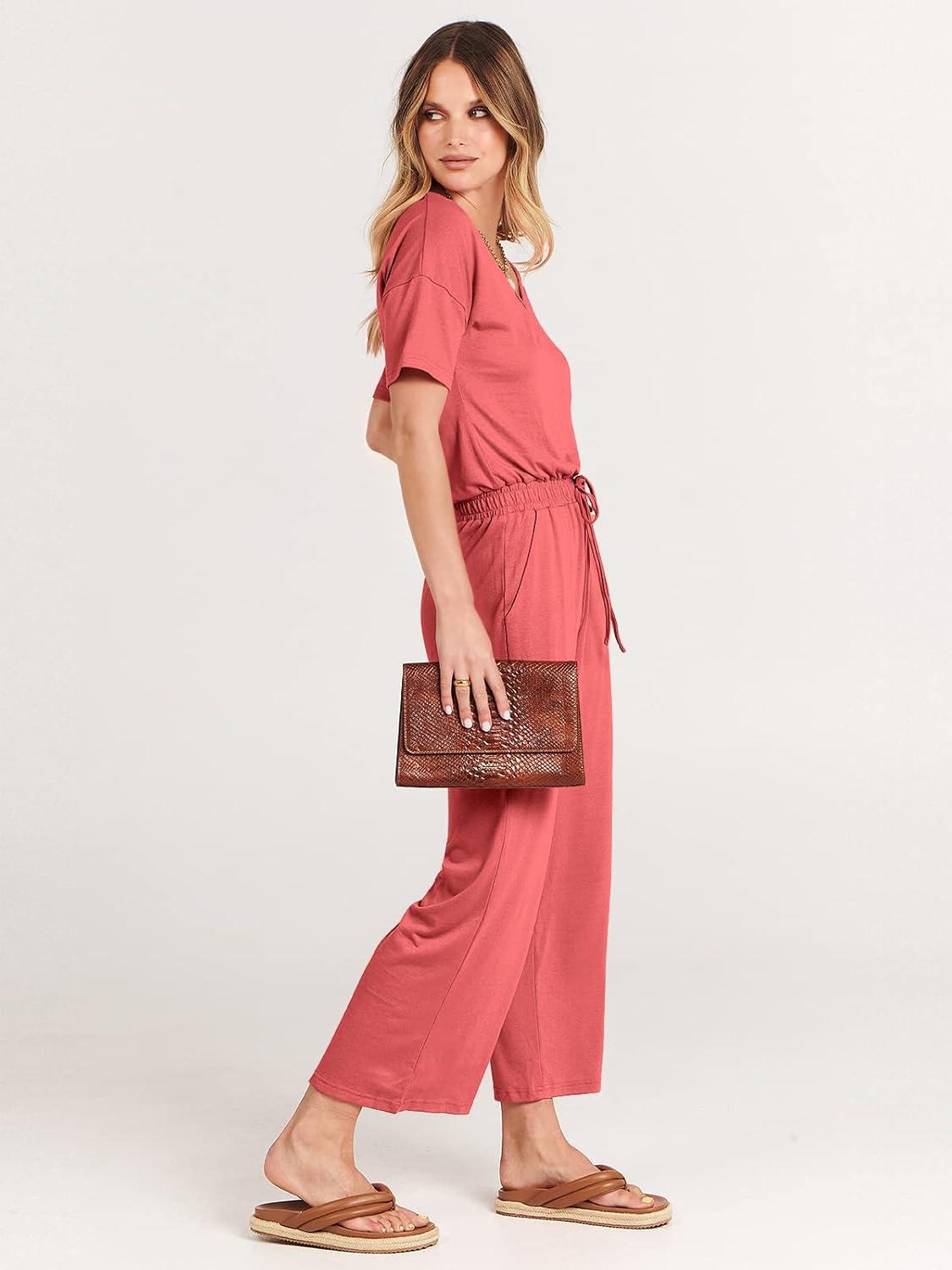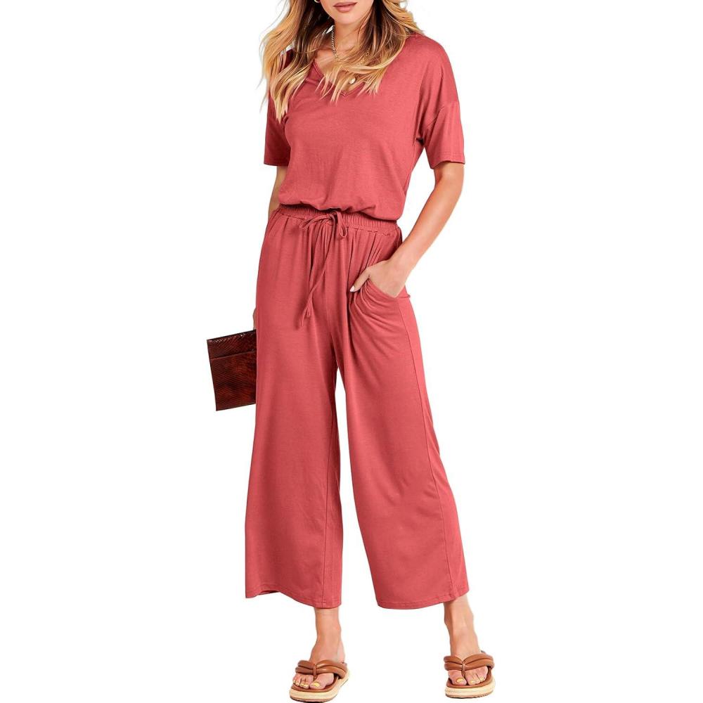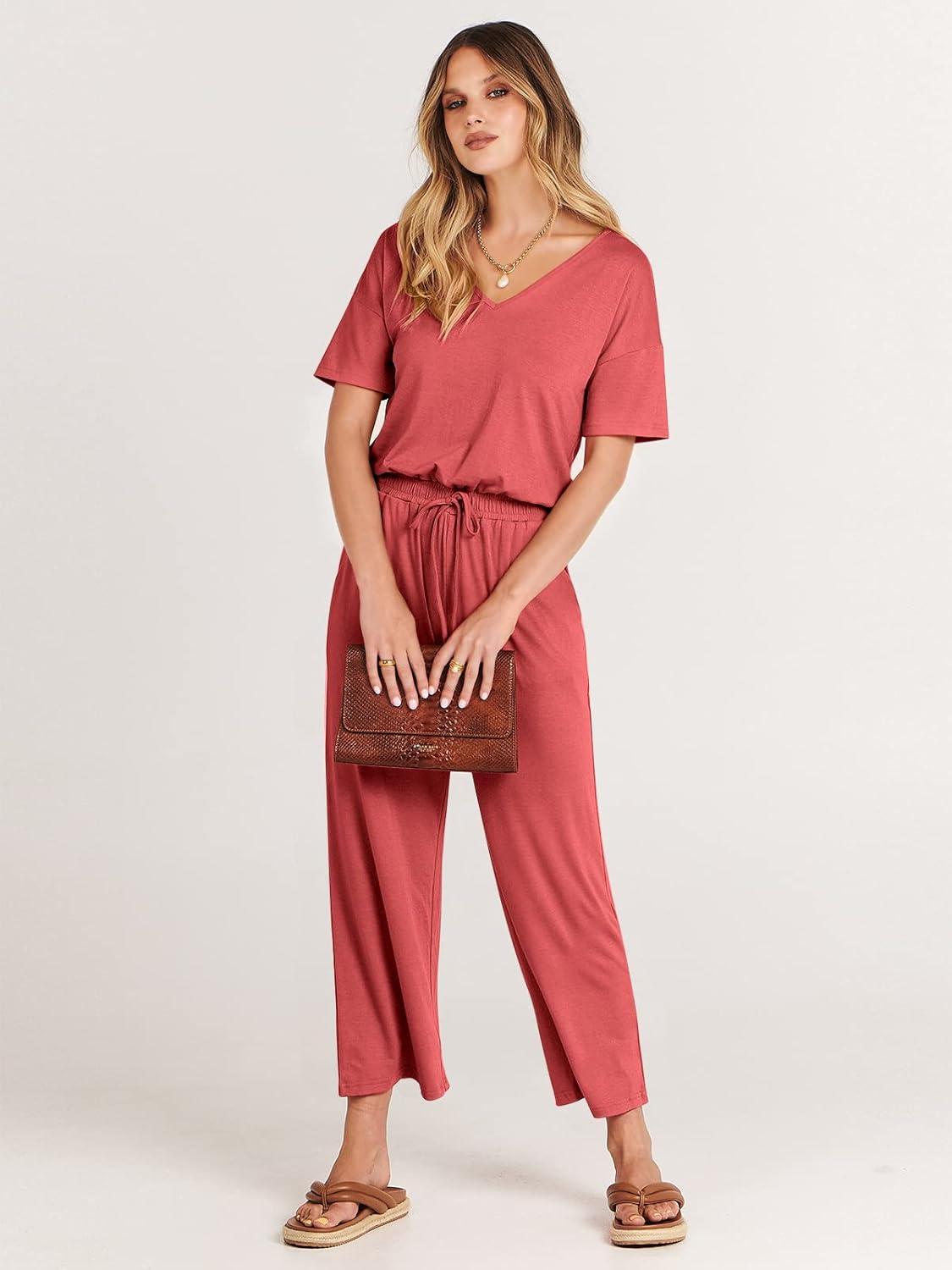 imageANRABESS Women Summer Casual Short Sleeve V Neck Elastic Waist Wide Leg Cropped Pants Jumpsuits Rompers with Pockets02peach