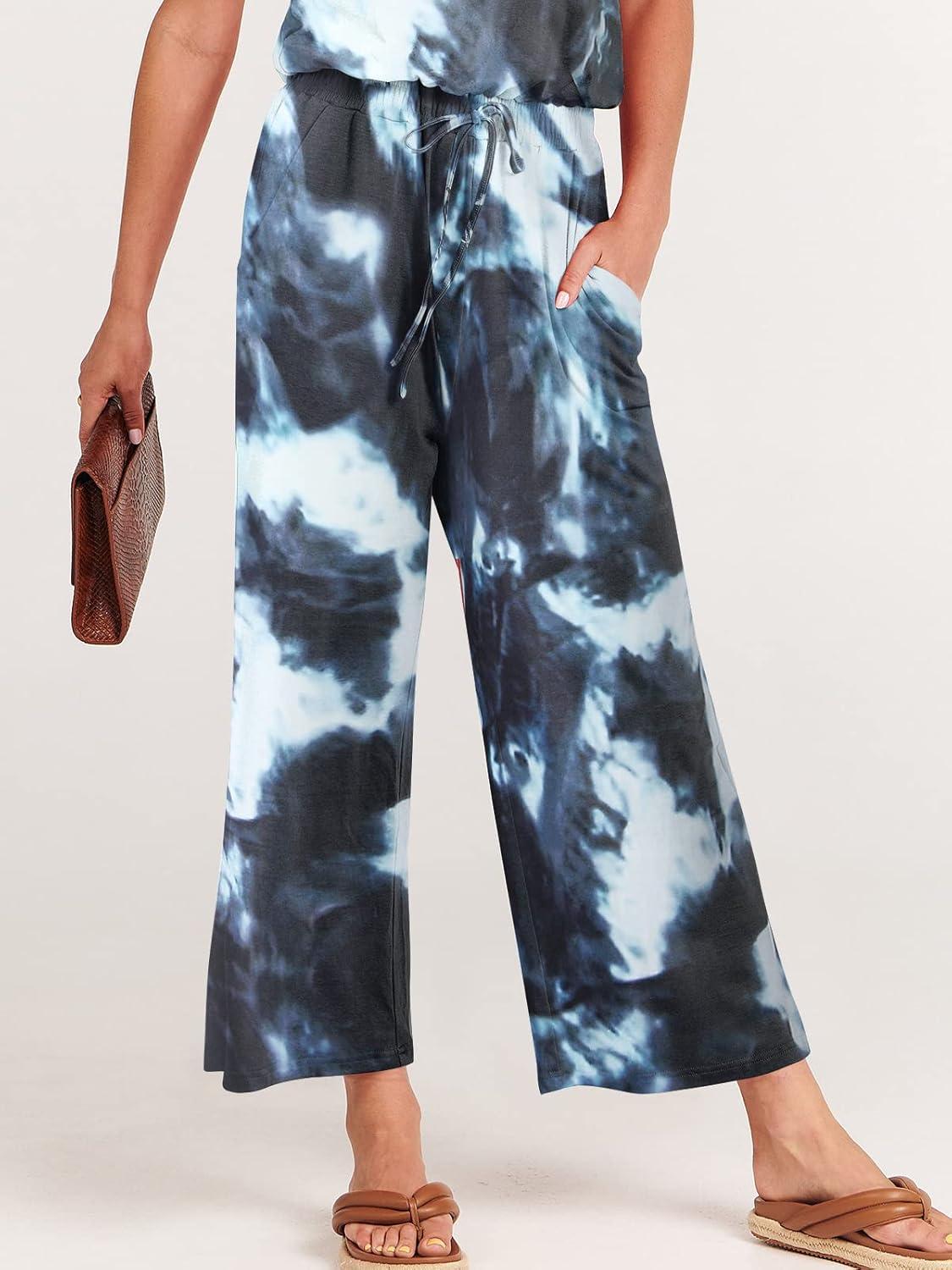 imageANRABESS Women Summer Casual Short Sleeve V Neck Elastic Waist Wide Leg Cropped Pants Jumpsuits Rompers with Pockets04tie Dye Navy