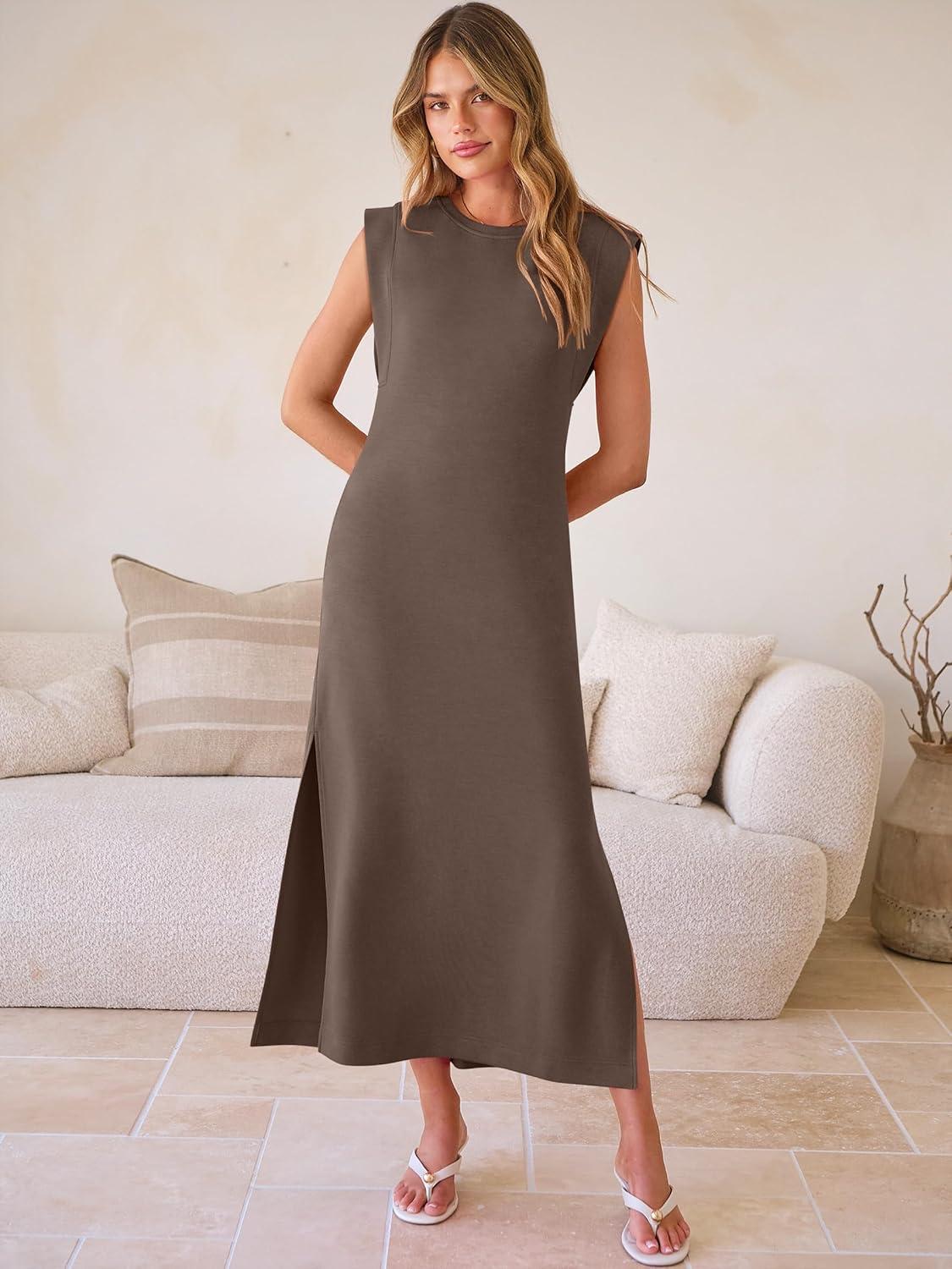 ANRABESS Women Summer Casual Sleeveless Maxi Dress 2026 Crewneck Loose Split Wrinkle-Free Beach Travel Vacation Long Sundress(Brown)