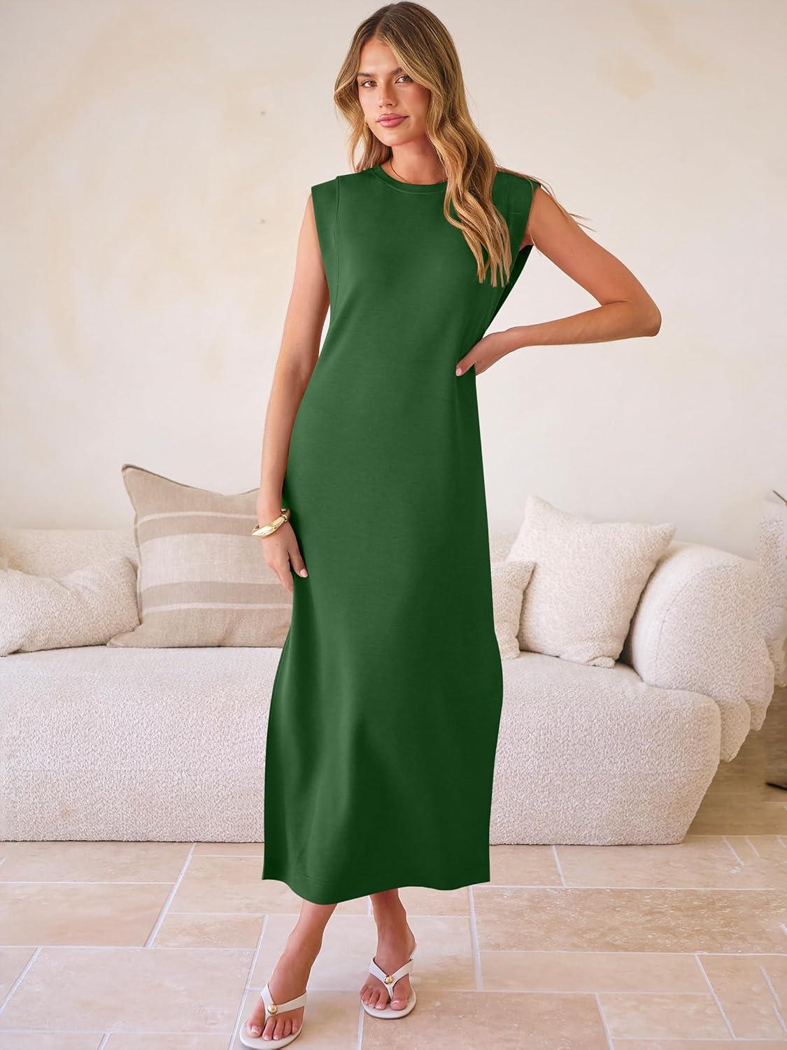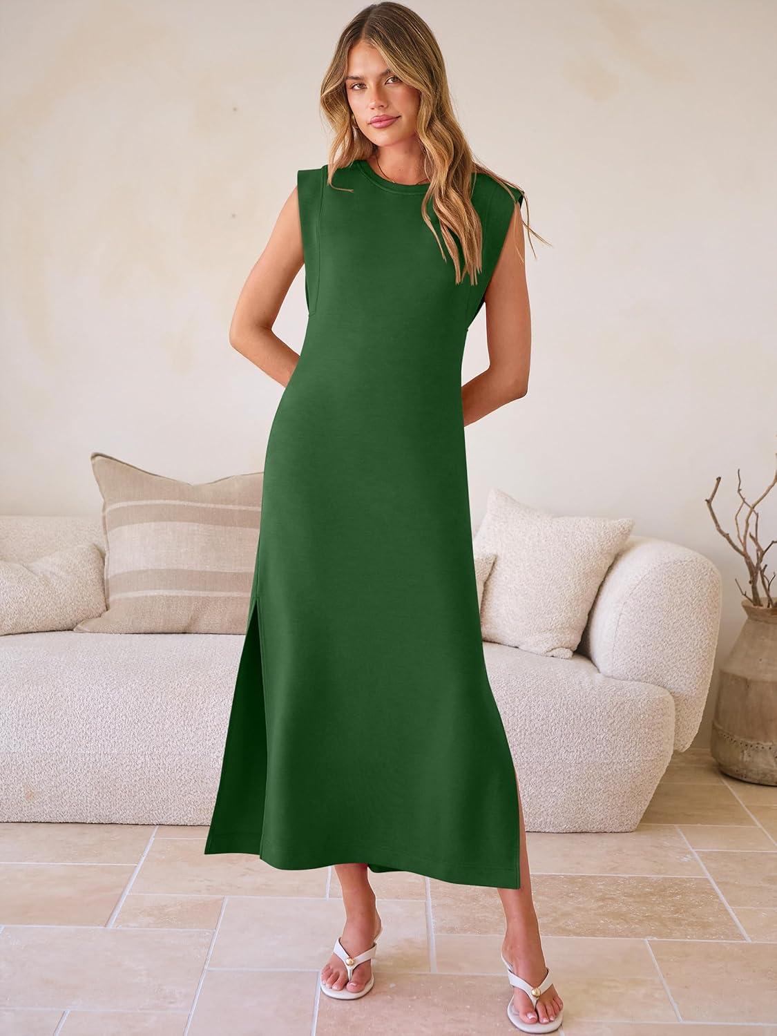 ANRABESS Women Summer Casual Sleeveless Maxi Dress 2026 Crewneck Loose Split Wrinkle-Free Beach Travel Vacation Long Sundress(Deep Green)