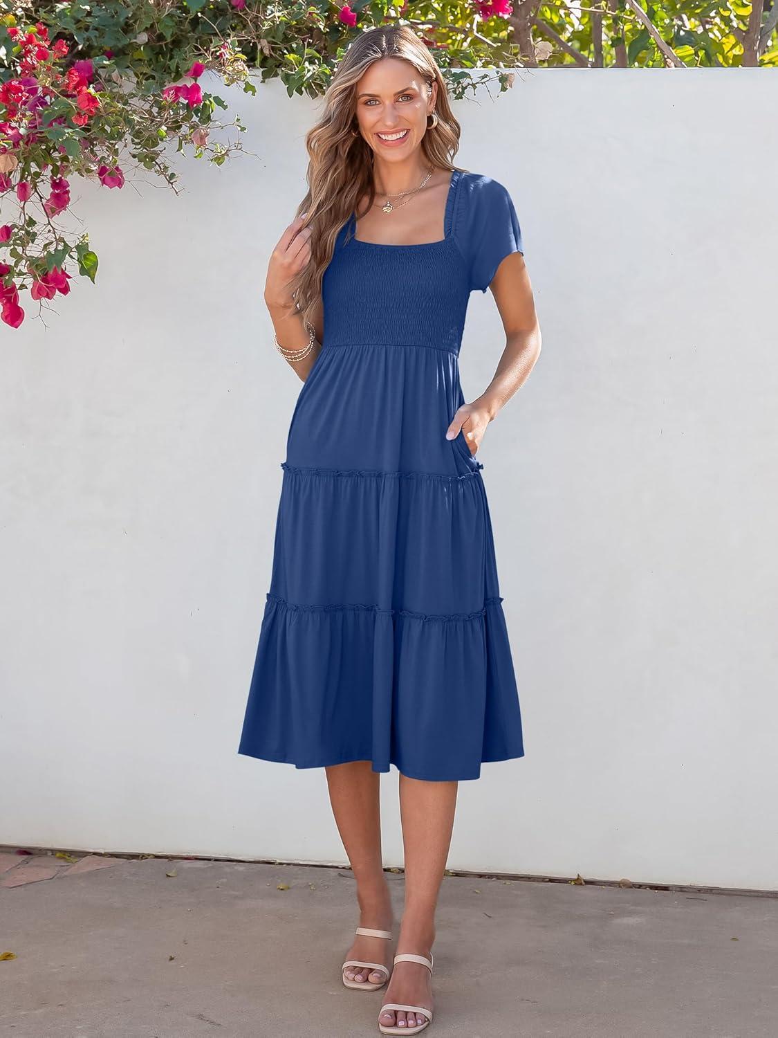 Our holiday sale features the best deals on ANRABESS Women Summer Casual Square Neck Flutter Sleeve Boho Smocked A-Line Flowy Tiered Modest Midi Sun Dress with Pockets(Blue) and accessories. Shop now and save!