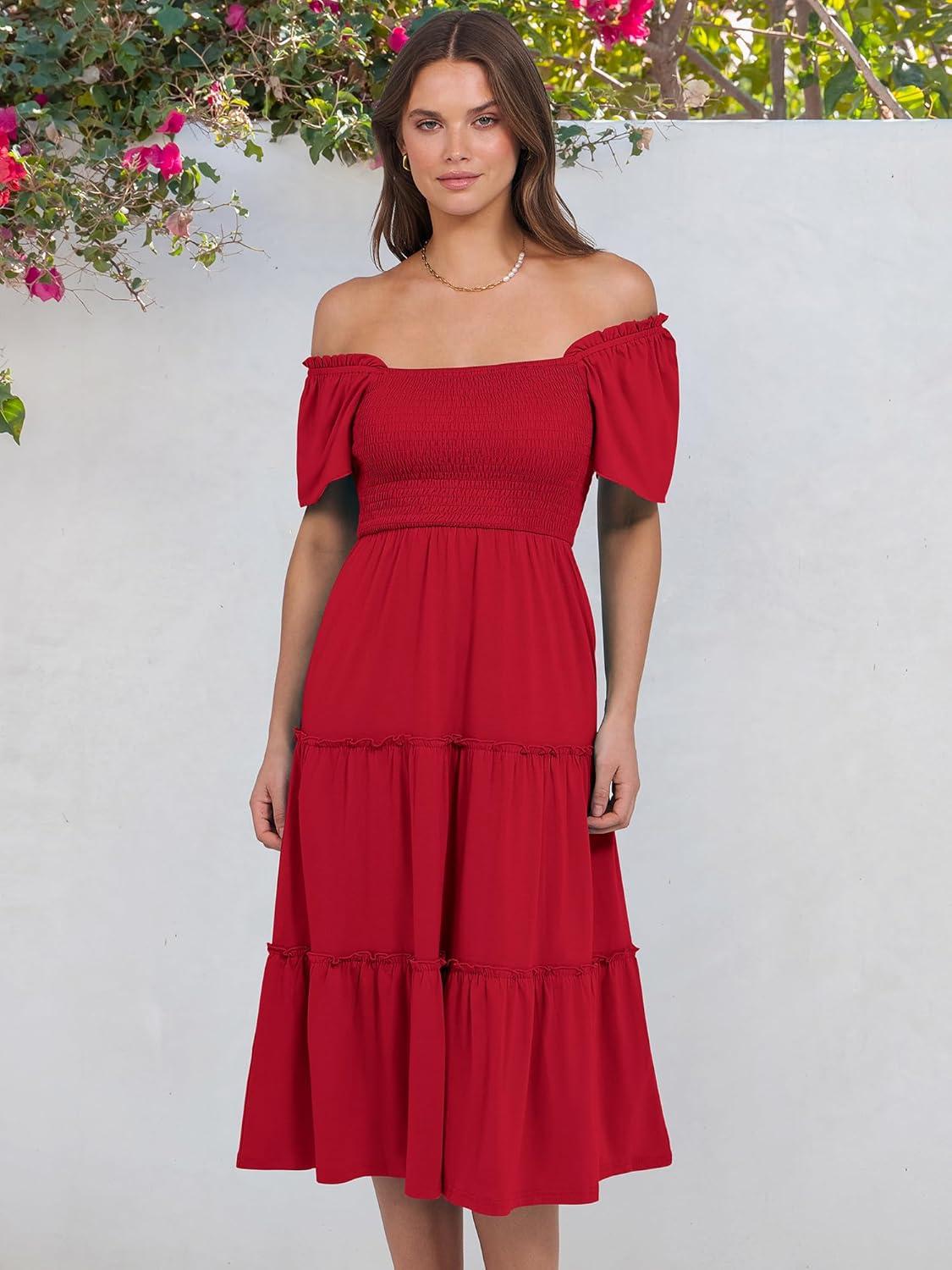 Get a free gift with your purchase of ANRABESS Women Summer Casual Square Neck Flutter Sleeve Boho Smocked A-Line Flowy Tiered Modest Midi Sun Dress with Pockets(Red). Limited quantities available!