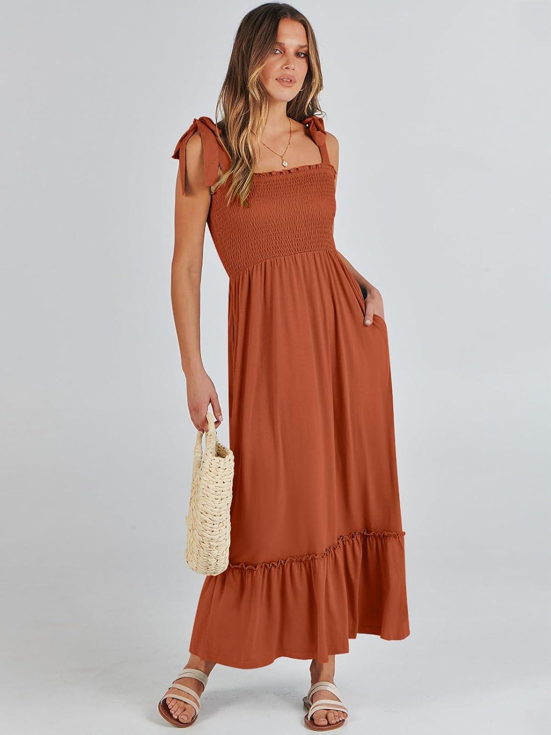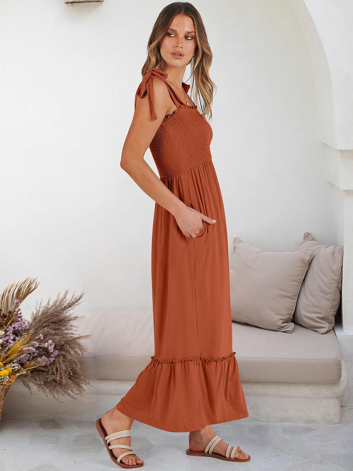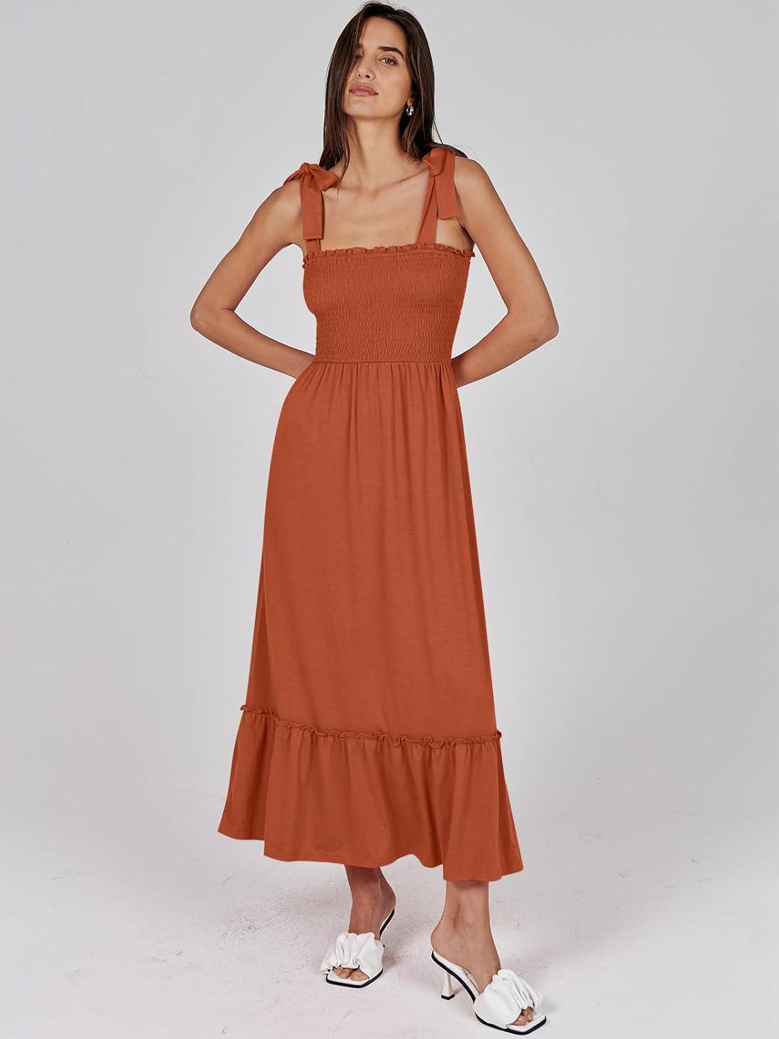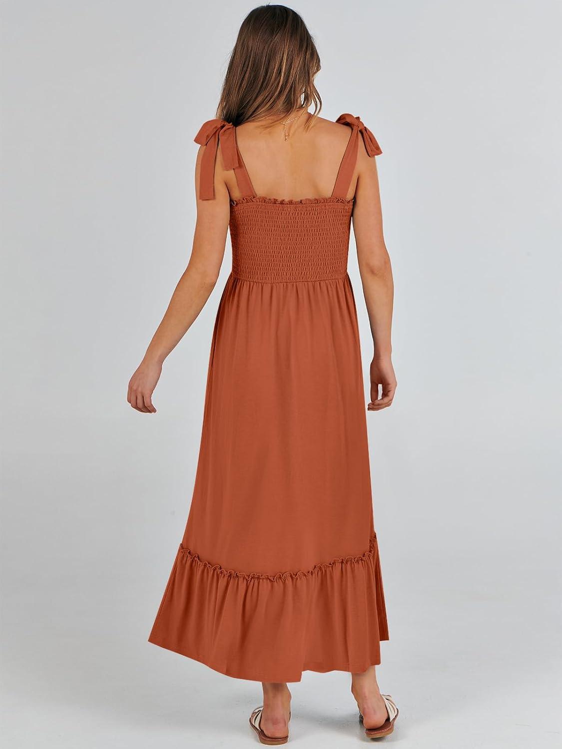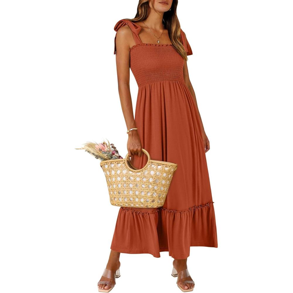 ANRABESS Women Summer Casual Strap Smocked Maxi Flowy Tiered A Line Beach Travel Sundress Wedding Guest Outfits(Brick Red)