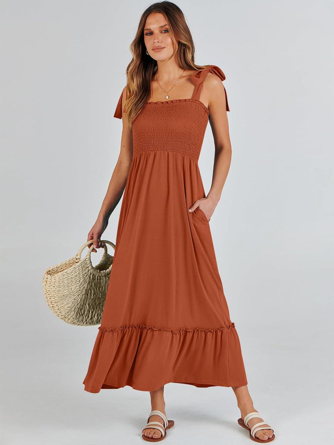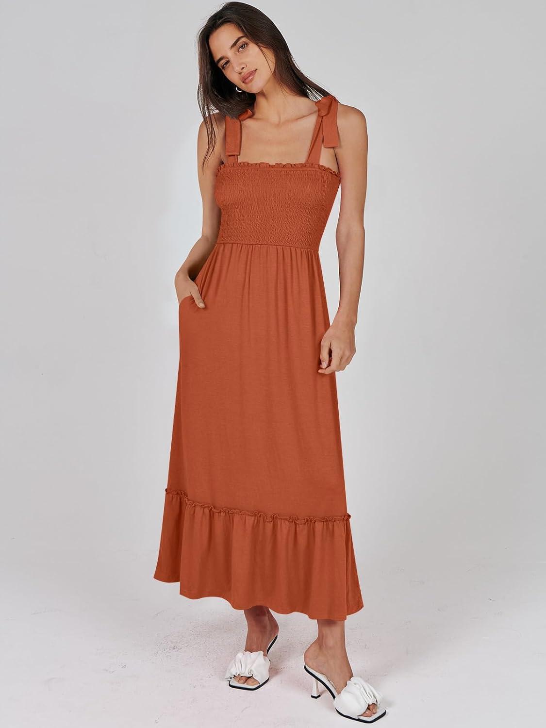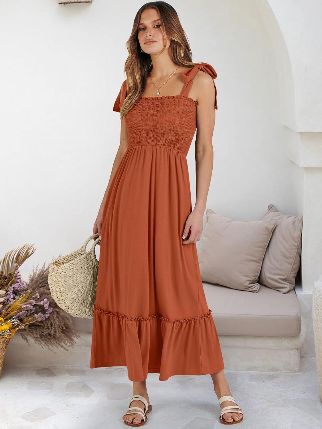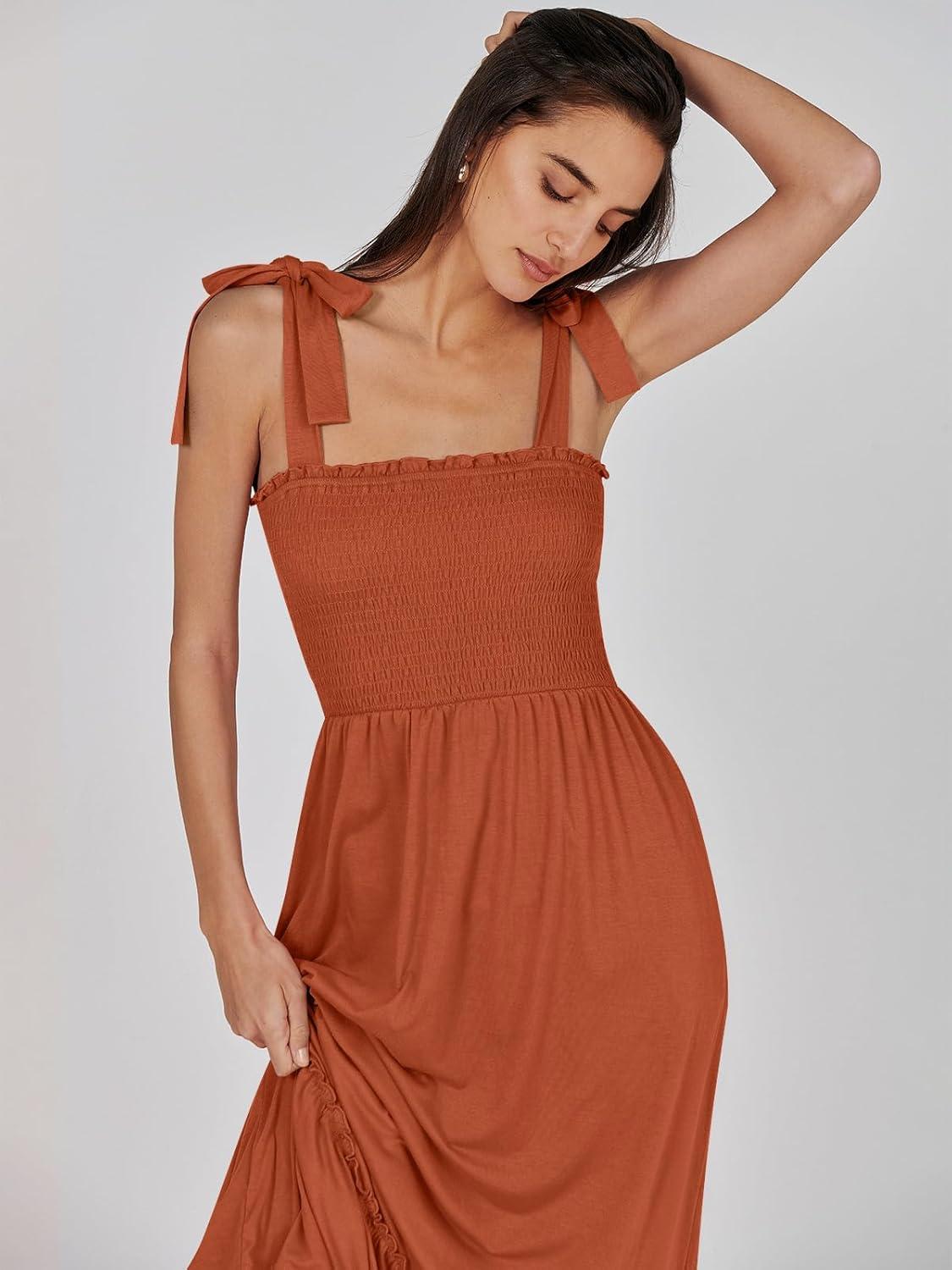 ANRABESS Women Summer Casual Strap Smocked Maxi Flowy Tiered A Line Beach Travel Sundress Wedding Guest Outfits(Brick Red)