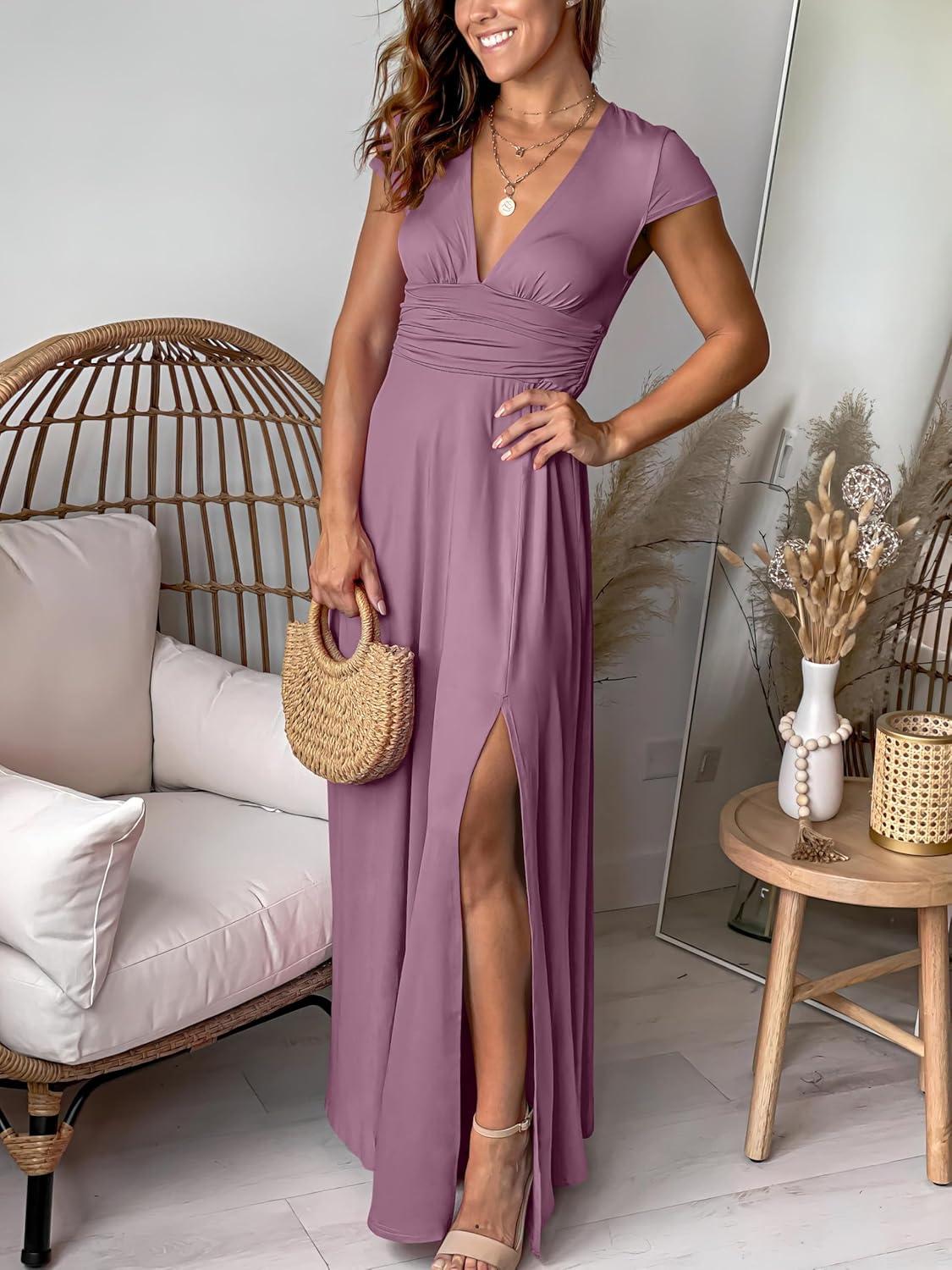 ANRABESS Women Summer Deep V Neck Short Sleeve Dresses Slit Elegant Wedding Guest Formal Cocktail Evening Maxi Long Dress(Short Sleeve Dark Pink)