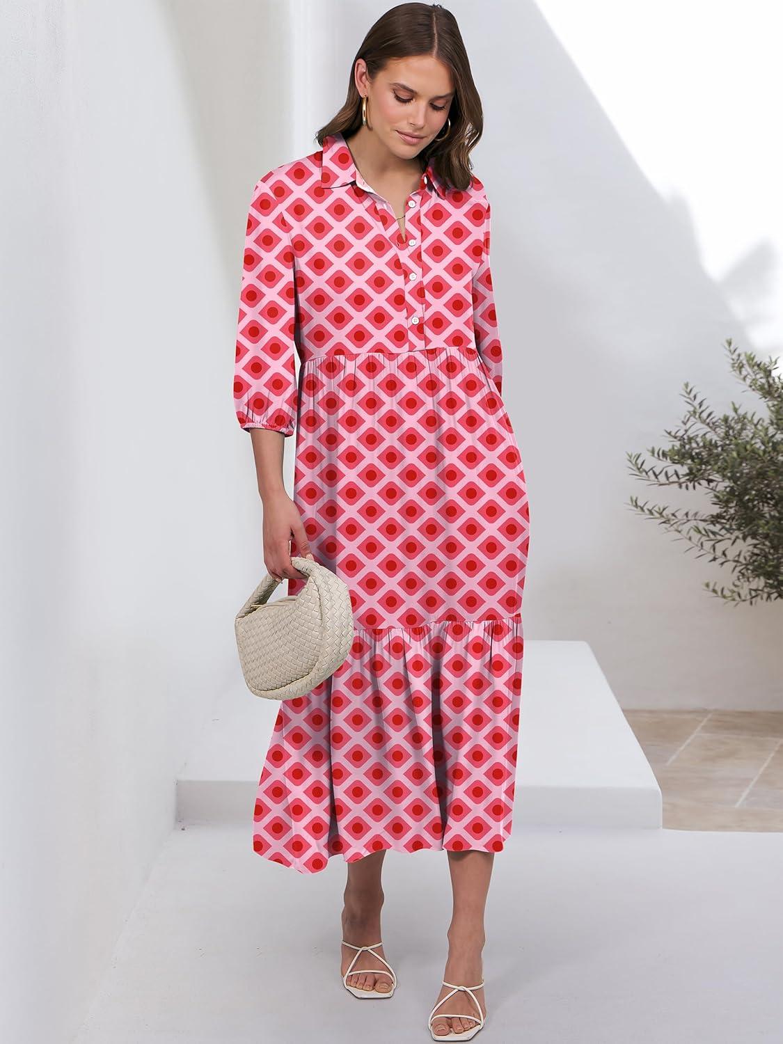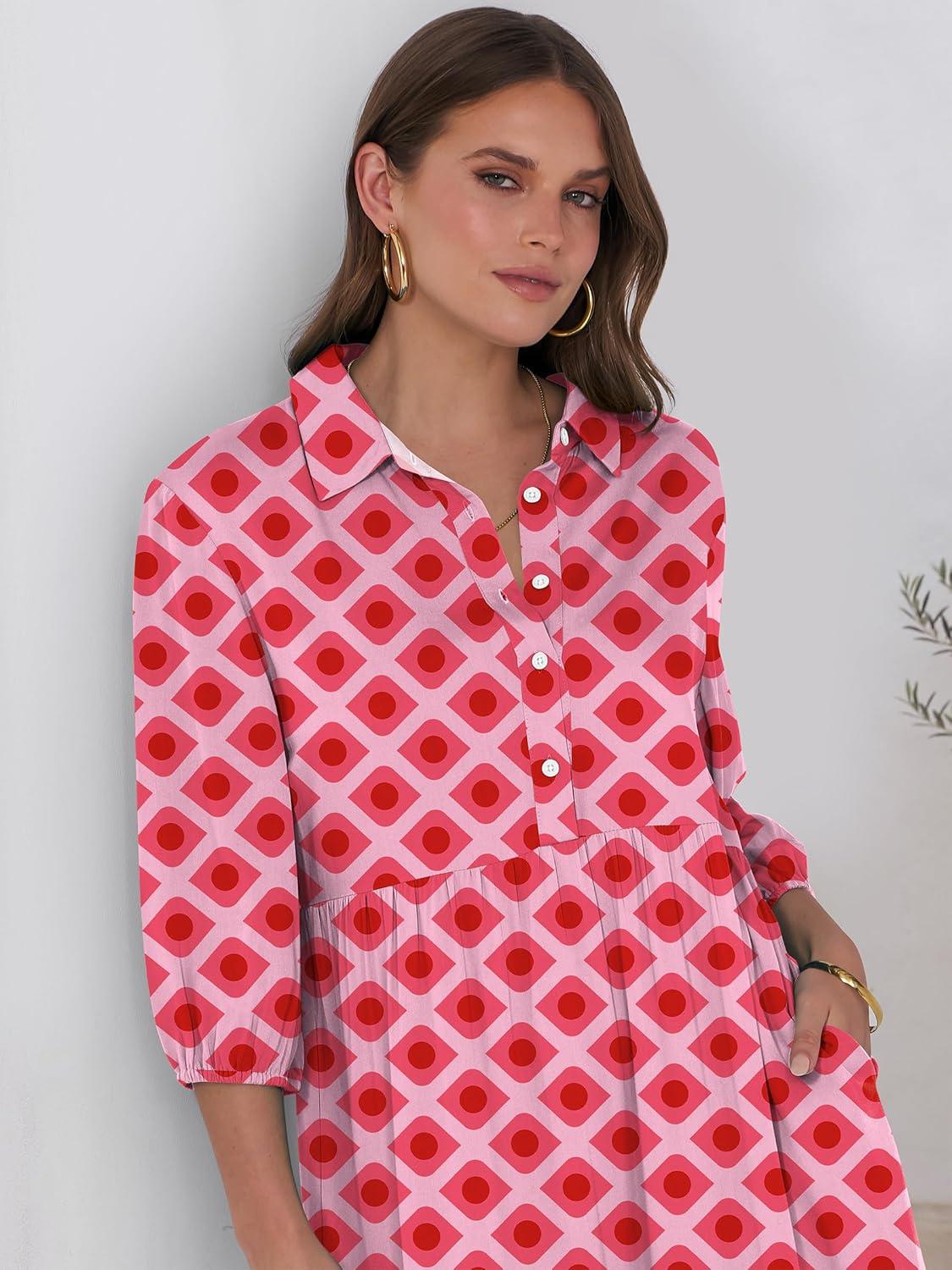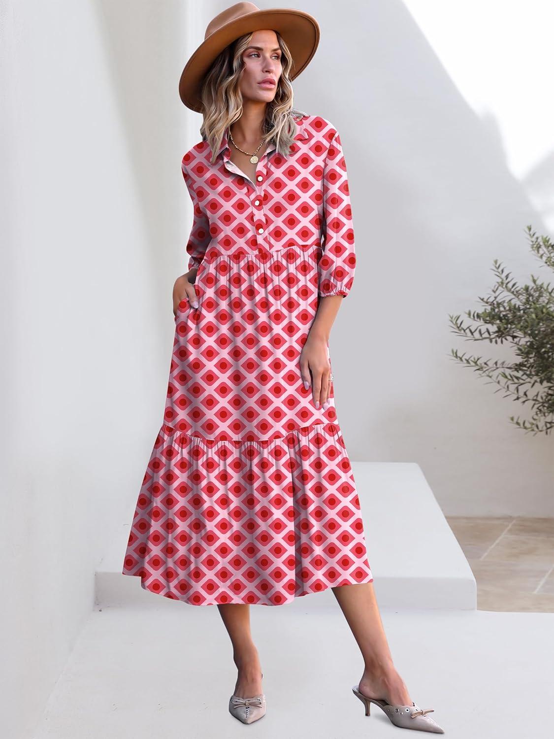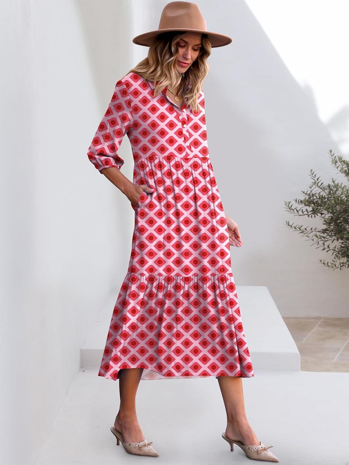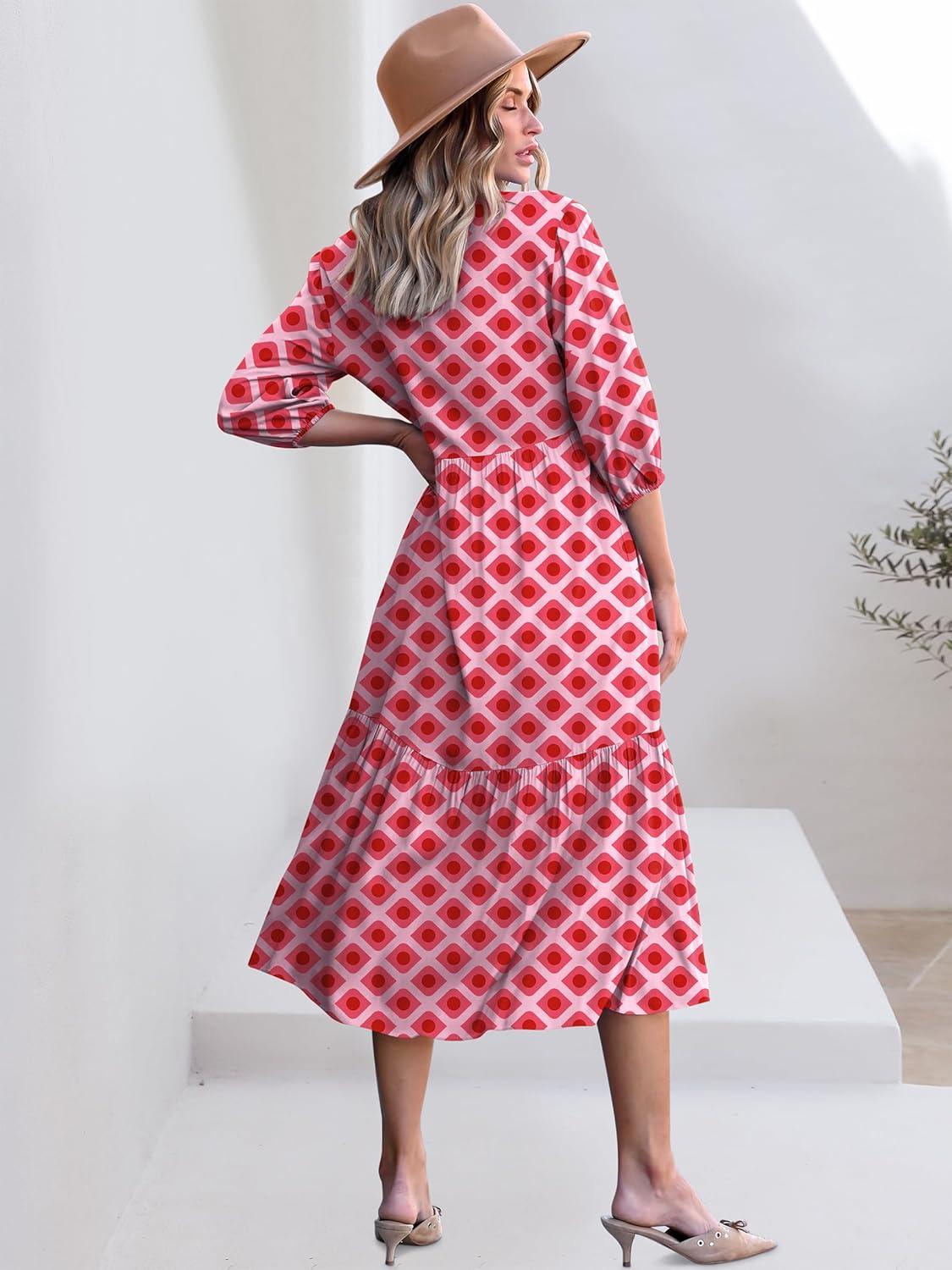 ANRABESS Women Summer Dress 2025 3/4 Puff Sleeve Polo V Neck Floral Print Casual Boho Shirt Maxi Dress Beach Vacation Clothes(Floral Red)