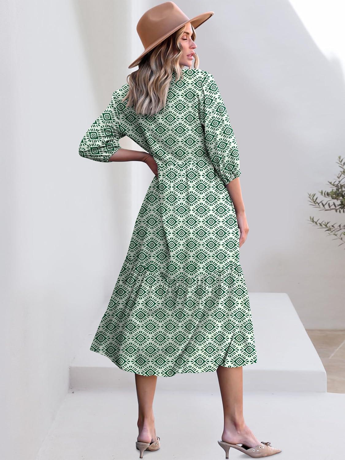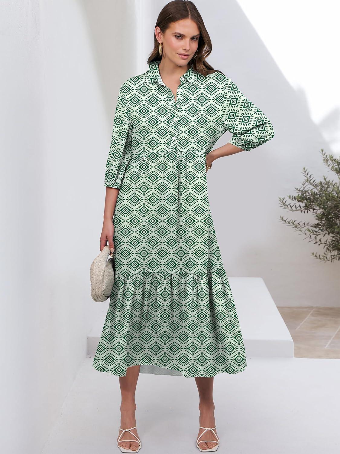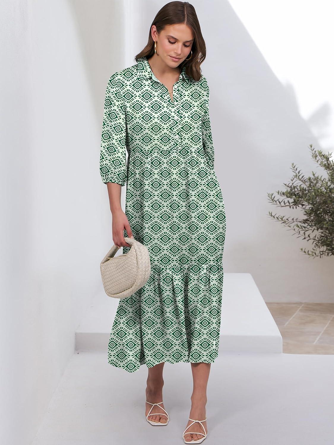 ANRABESS Women Summer Dress 2025 3/4 Puff Sleeve Polo V Neck Floral Print Casual Boho Shirt Maxi Dress Beach Vacation Clothes(Green)