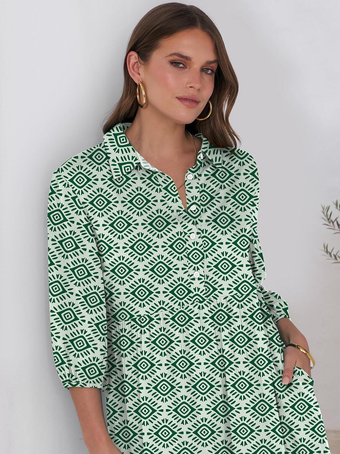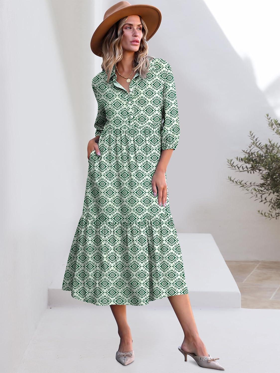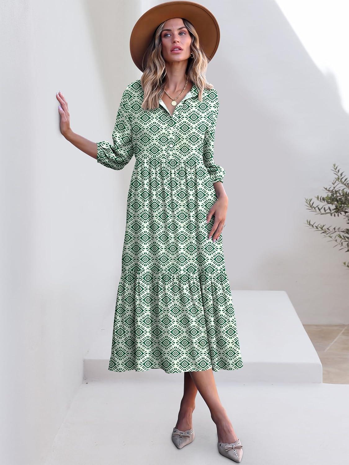 ANRABESS Women Summer Dress 2025 3/4 Puff Sleeve Polo V Neck Floral Print Casual Boho Shirt Maxi Dress Beach Vacation Clothes(Green)