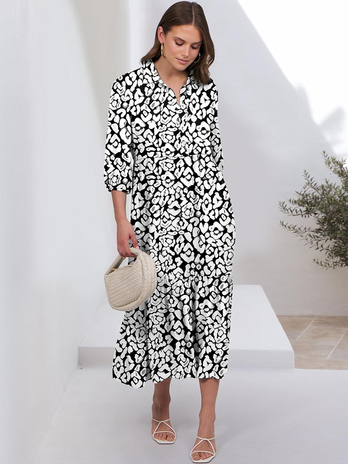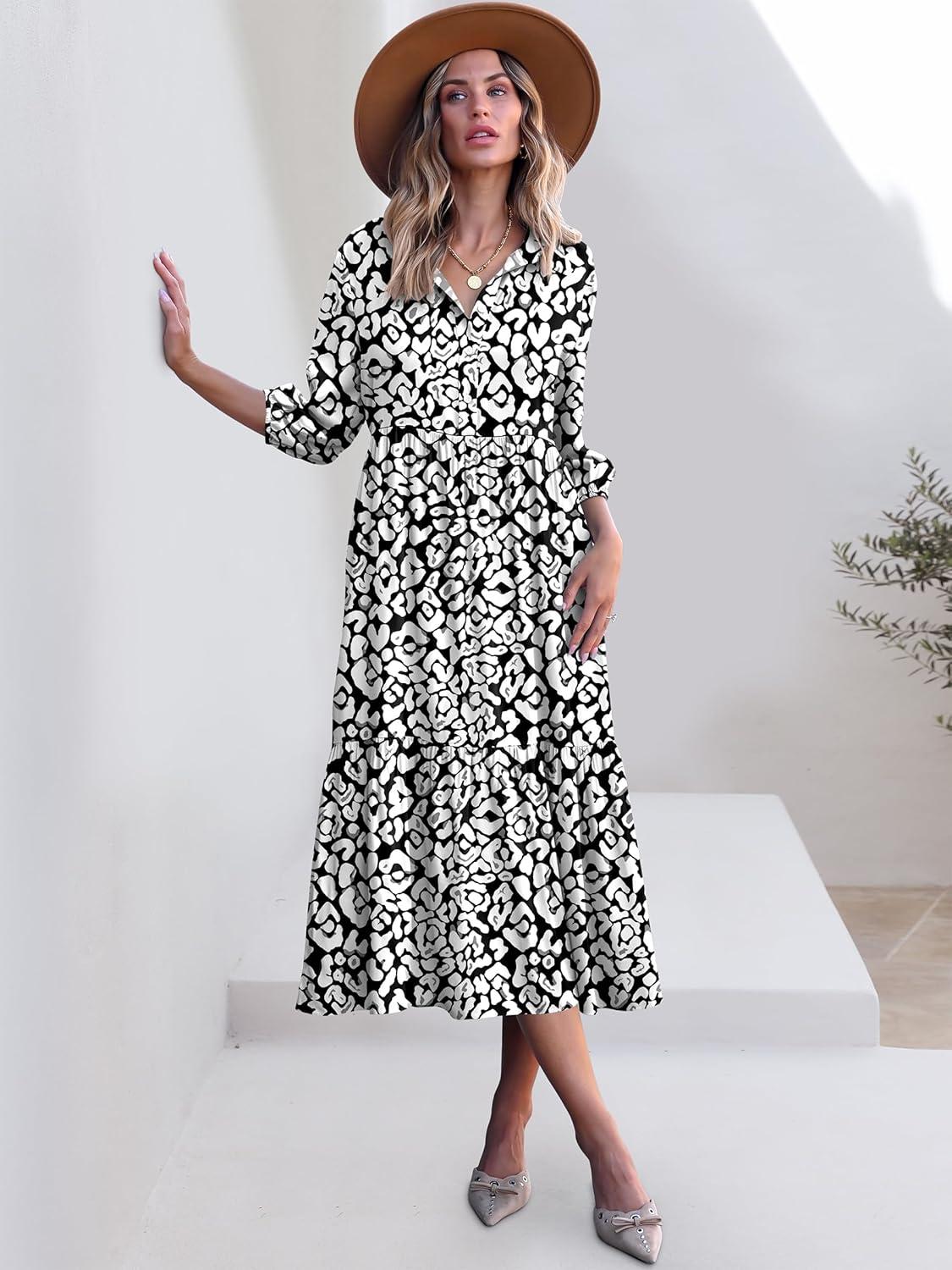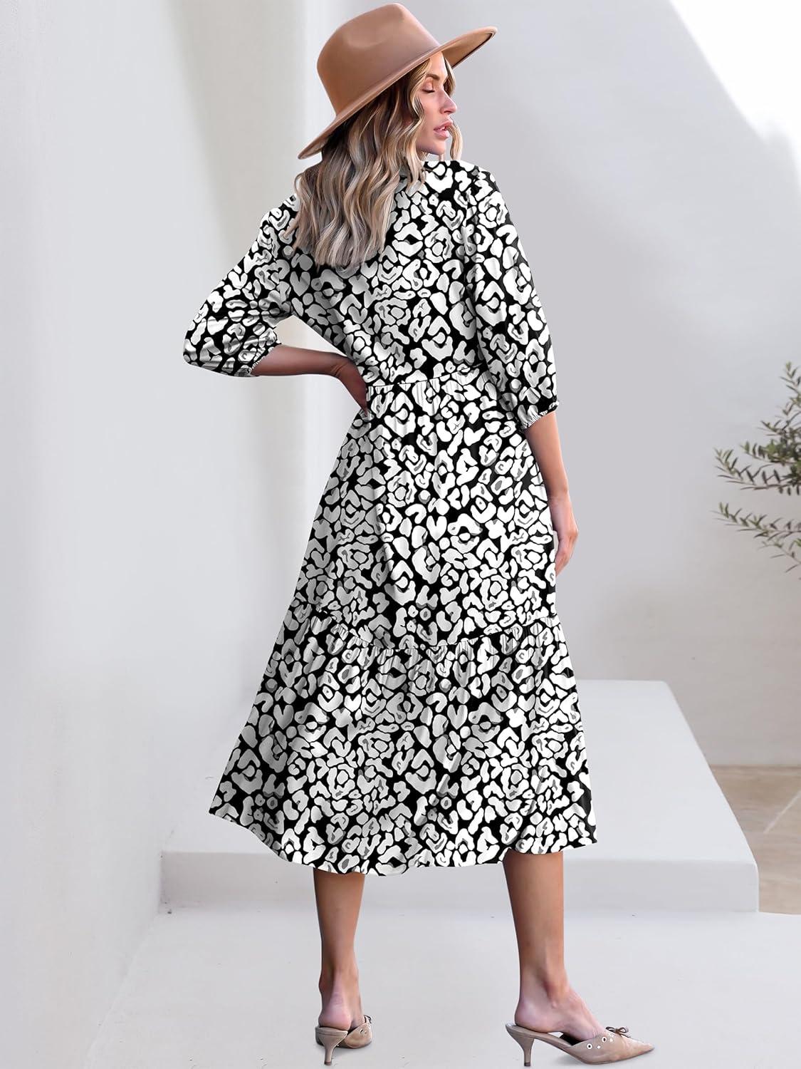 ANRABESS Women Summer Dress 2025 3/4 Puff Sleeve Polo V Neck Floral Print Casual Boho Shirt Maxi Dress Beach Vacation Clothes(Leopard Print)