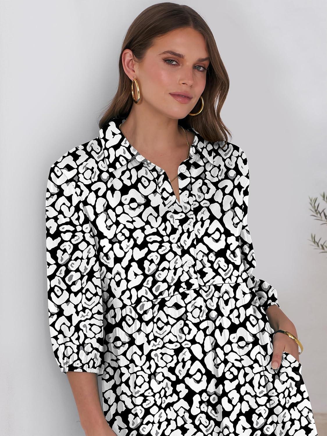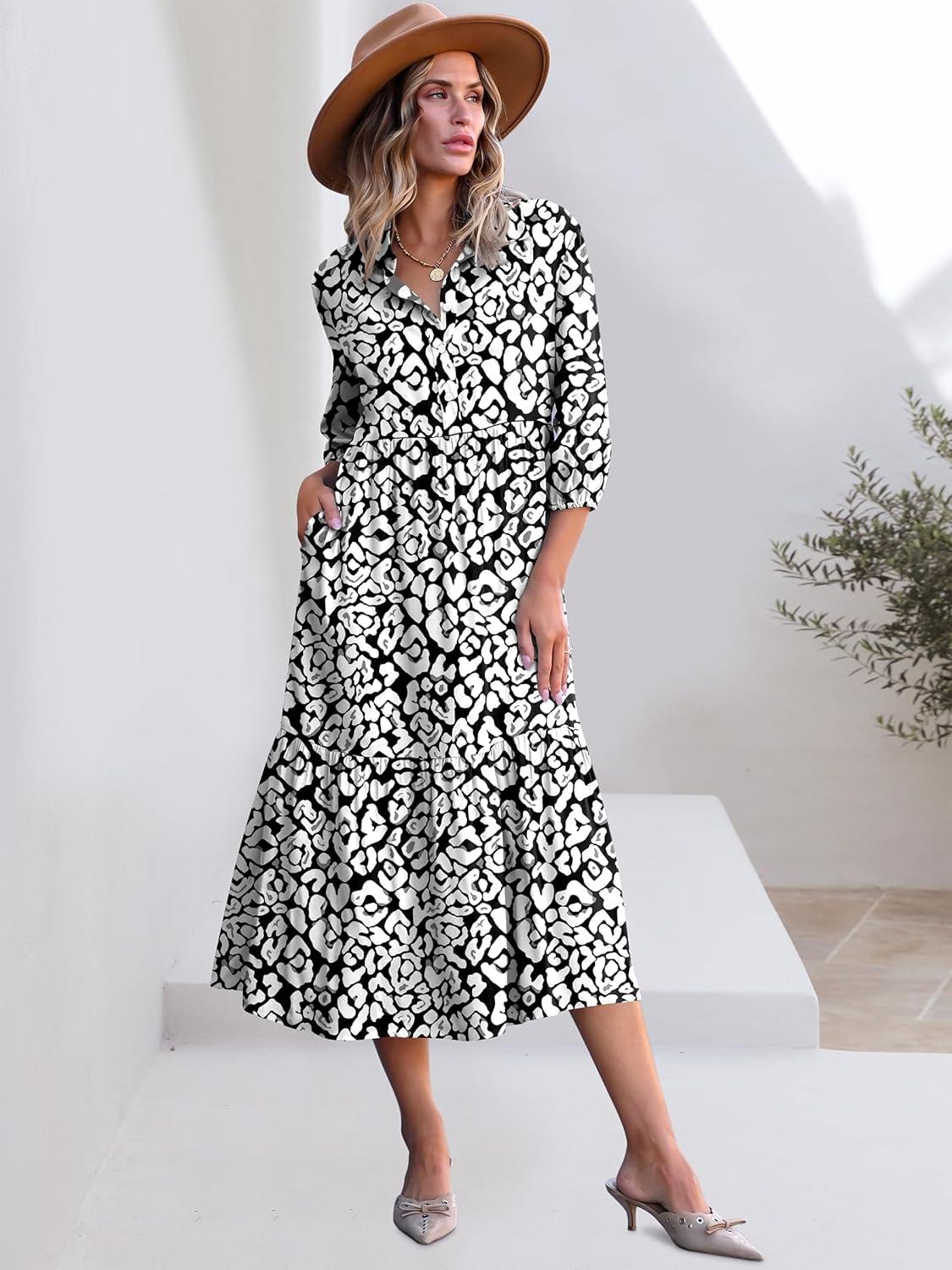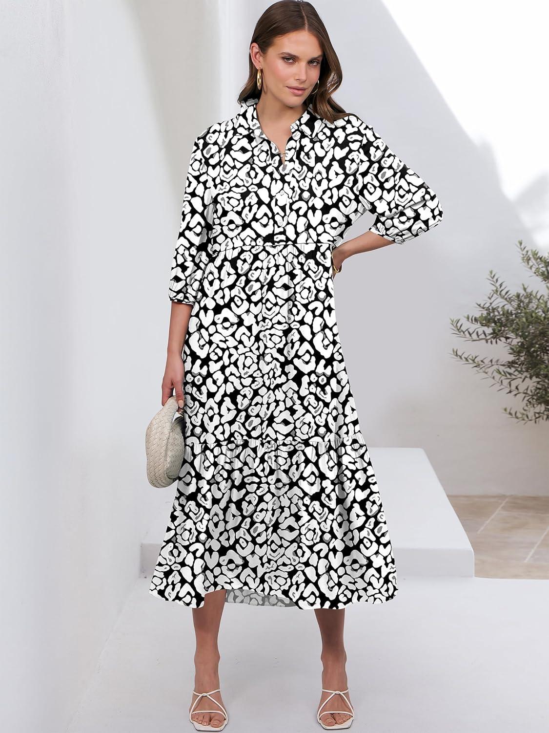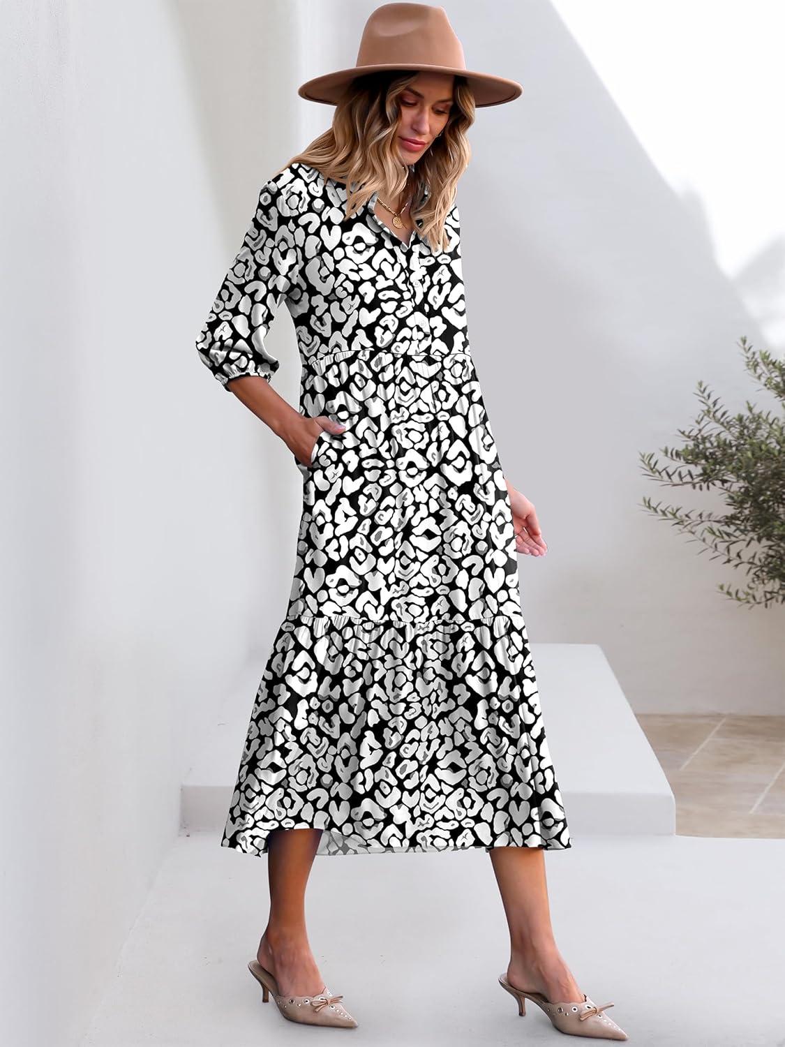 ANRABESS Women Summer Dress 2025 3/4 Puff Sleeve Polo V Neck Floral Print Casual Boho Shirt Maxi Dress Beach Vacation Clothes(Leopard Print)