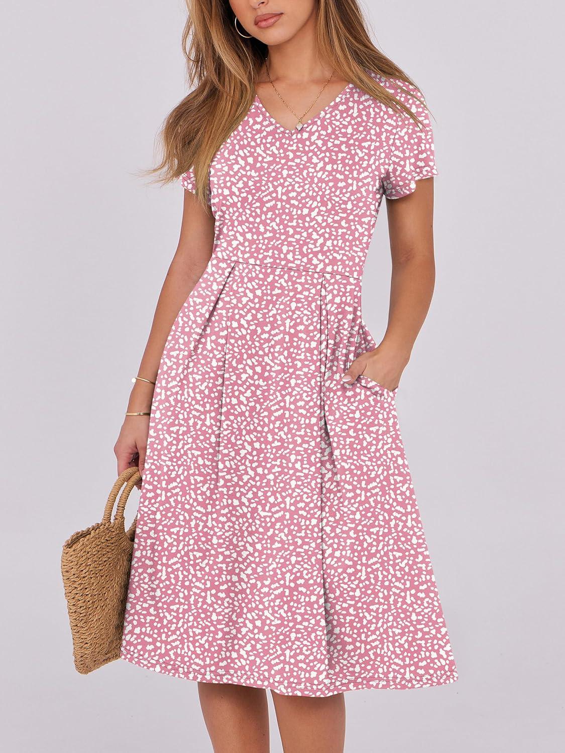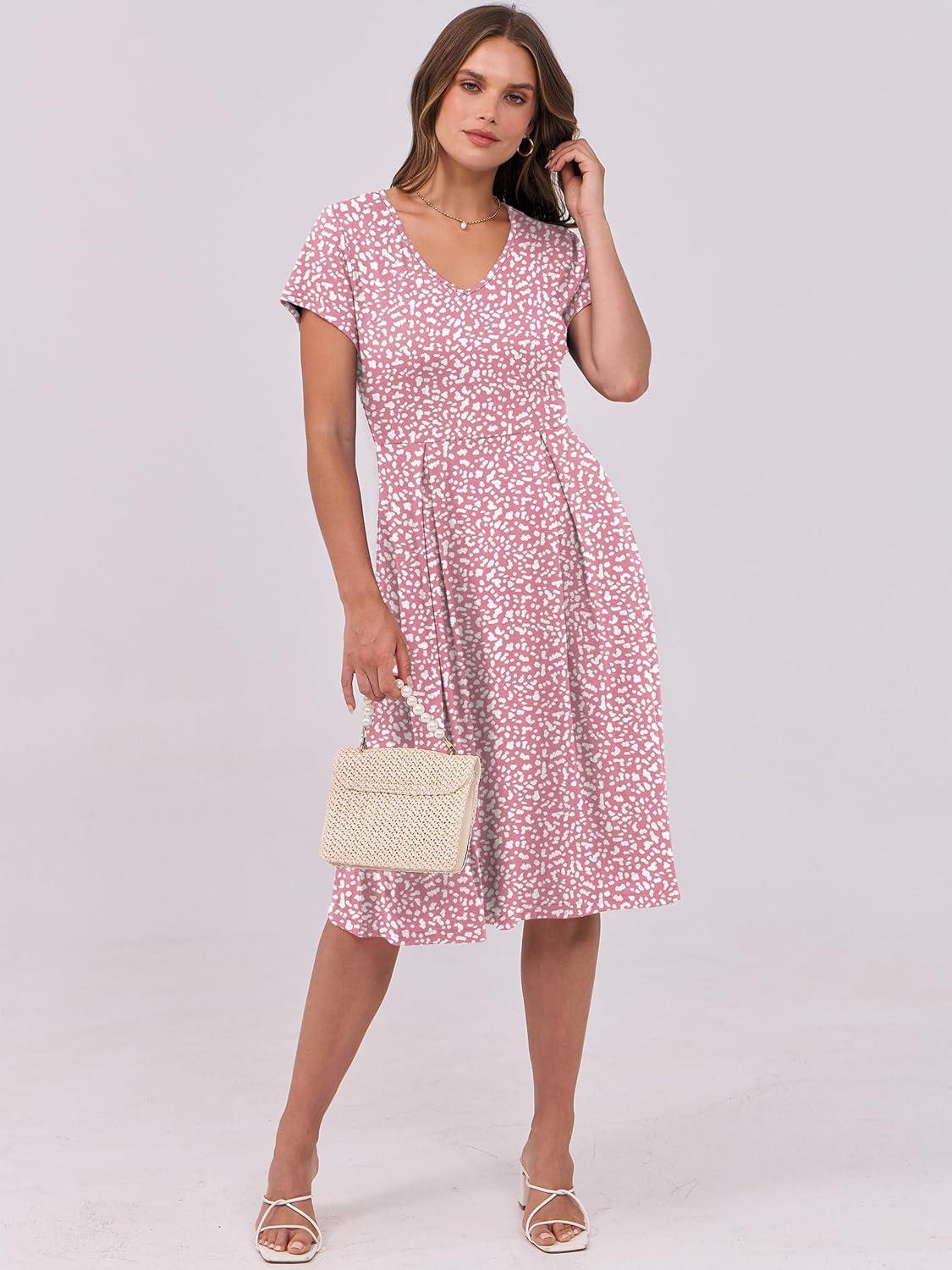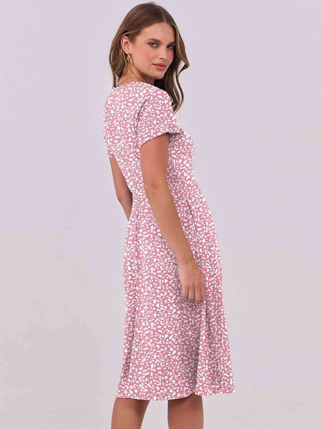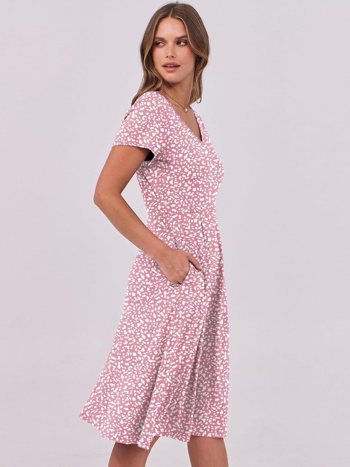 ANRABESS Women Summer Dress Casual Short Sleeve V Neck A-Line Knee Length Pleated Flowy 2025 Fashion Midi Dresses with Pocket(Pink White Dot)