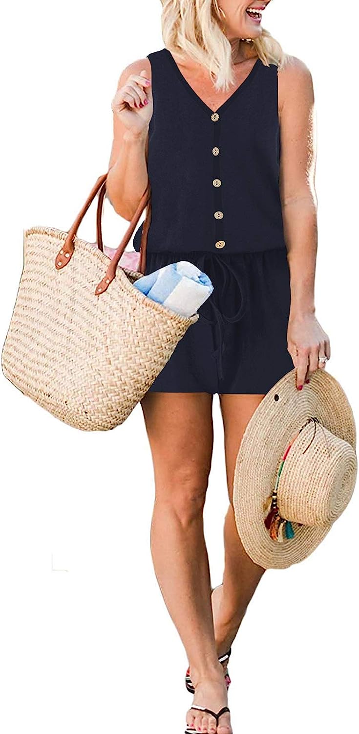 Perfect in the summer/spring daily!spaghetti strap romper,tank romper,v neck button down,cami jumpsuit,solid sleeveless outfit,round neck,,elastic waist with ties,short pants jumpsuits,with two pockets.casual elegant and chic jumpsuit romper.