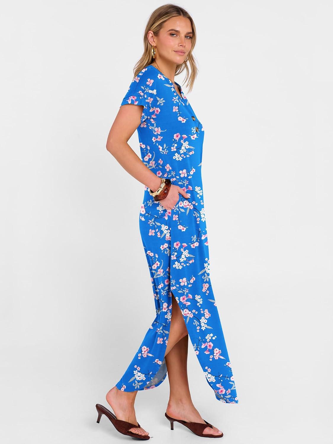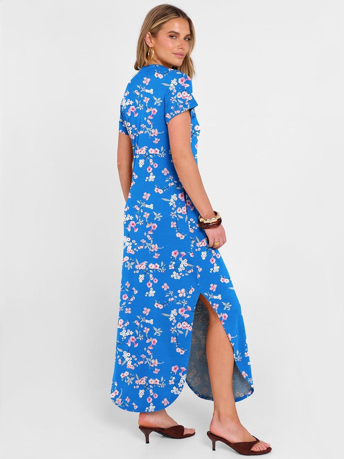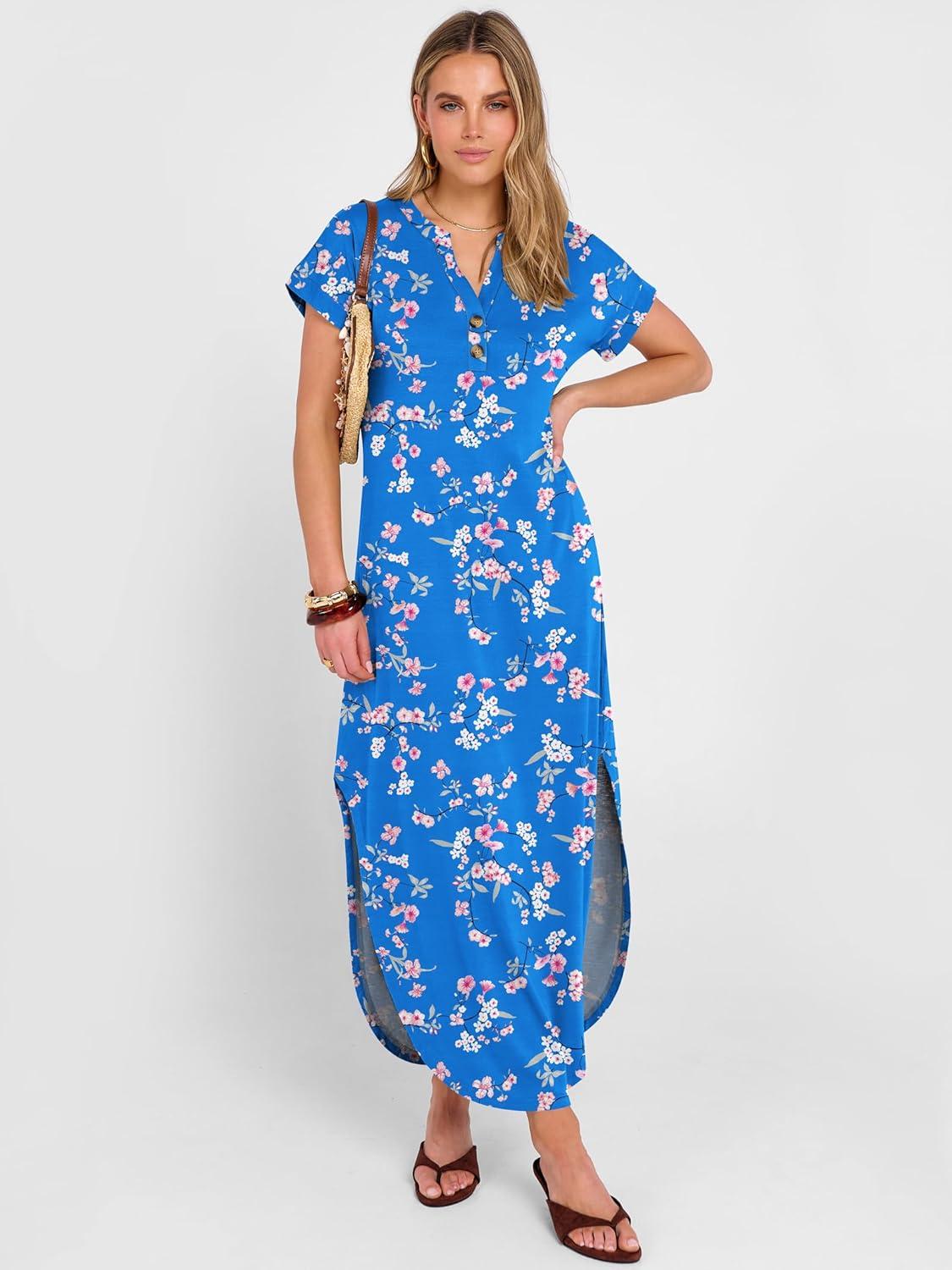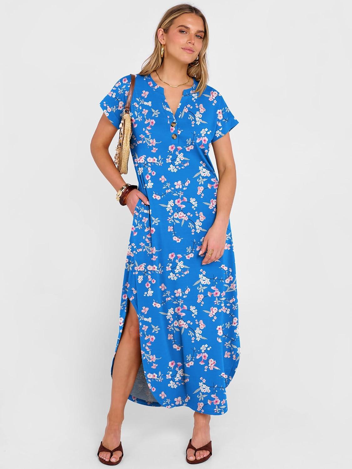 ANRABESS Women Summer Maxi Dress Casual Short Sleeve V Neck Button Up Loose Split Travel Dresses 2026 Beach Vacation Sundress(Blue Pink Floral)