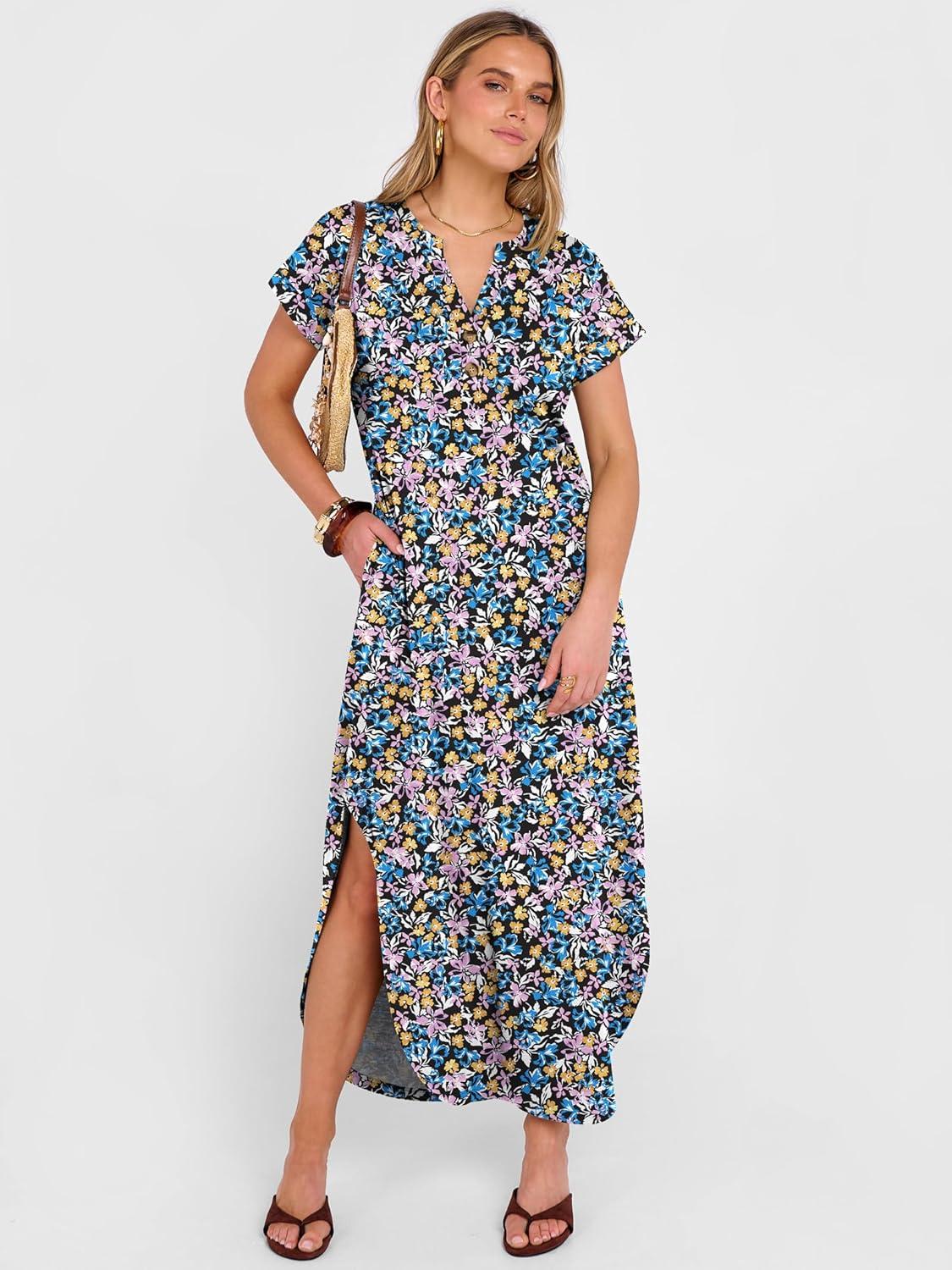 ANRABESS Women Summer Maxi Dress Casual Short Sleeve V Neck Button Up Loose Split Travel Dresses 2026 Beach Vacation Sundress(Blue Purple Floral)