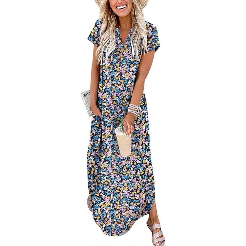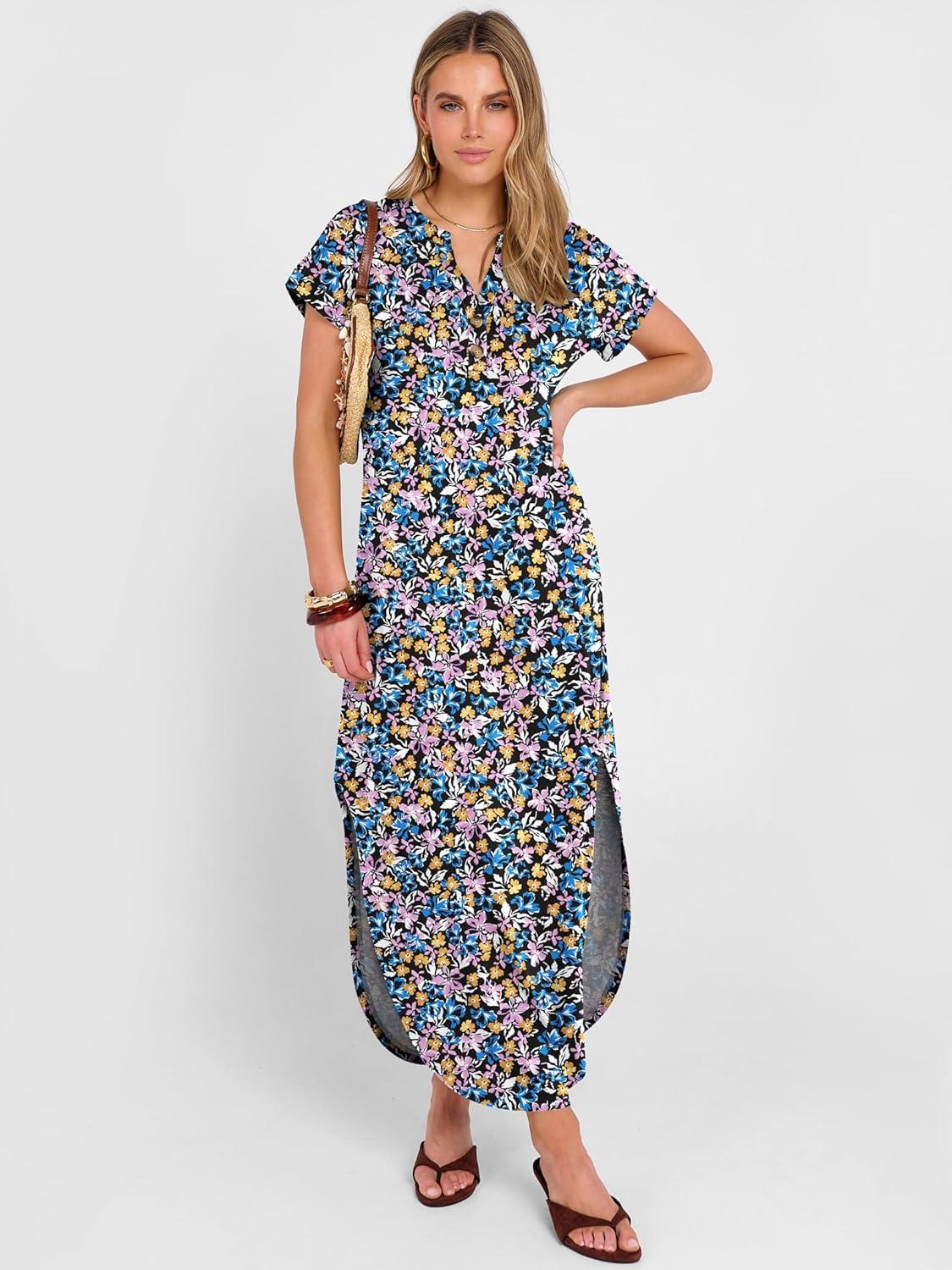 ANRABESS Women Summer Maxi Dress Casual Short Sleeve V Neck Button Up Loose Split Travel Dresses 2026 Beach Vacation Sundress(Blue Pink Floral)