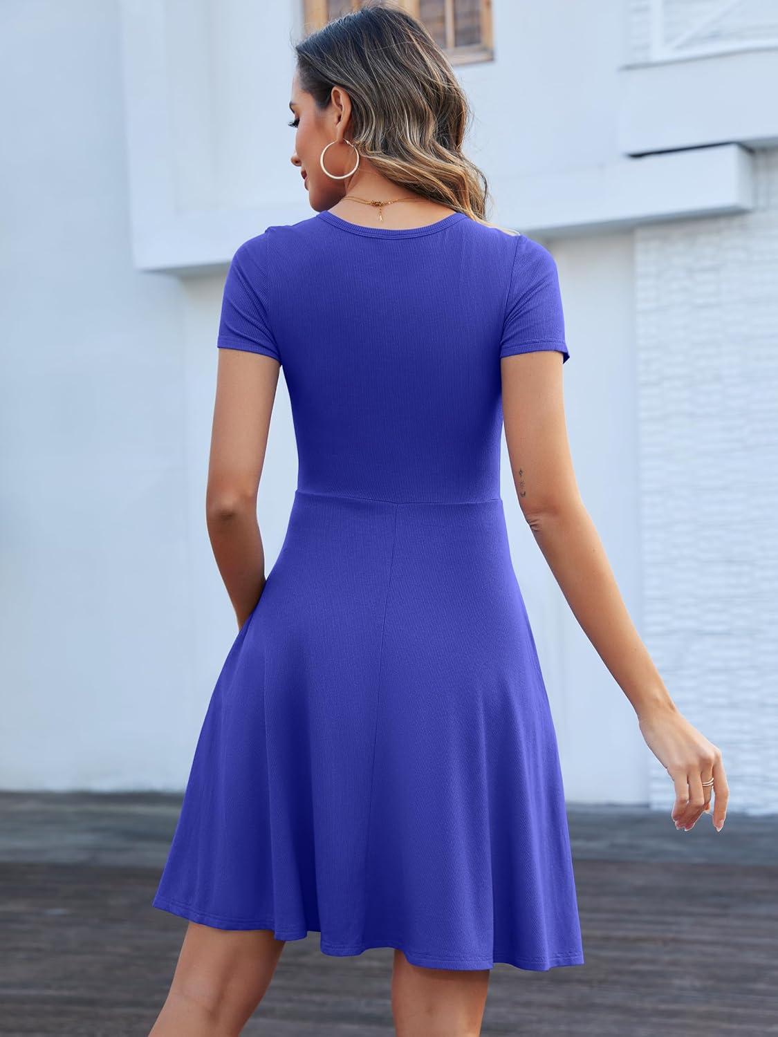 ANRABESS Women Summer Short Sleeve Ribbed Knit Fit & Flare A-Line Flowy Business Casual Work Basic Mini Dress with Pockets(Blue)
