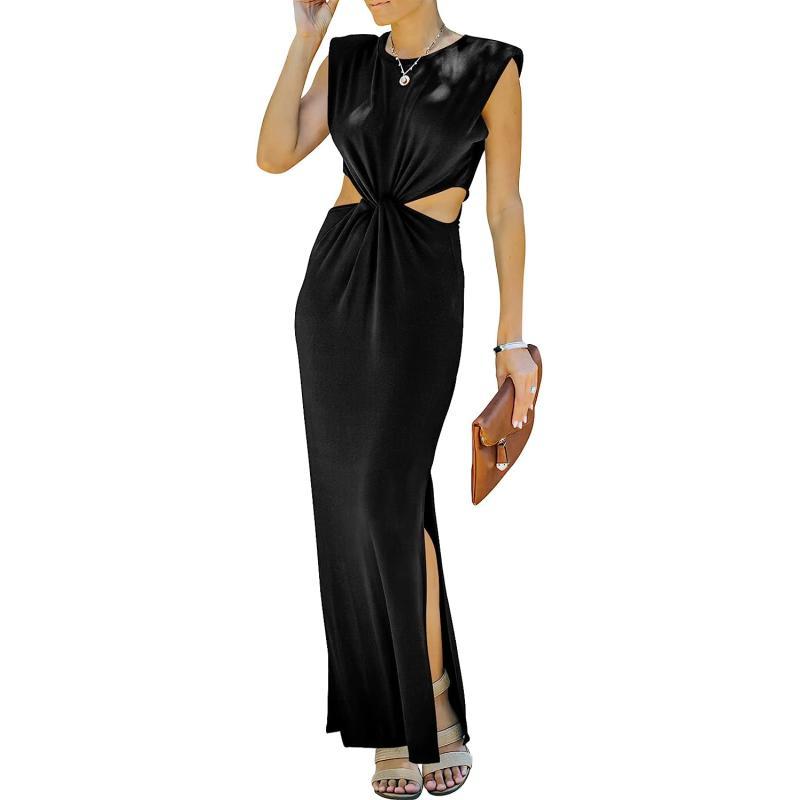 imageANRABESS Women Summer Sleeveless Padded Shoulder Sexy Cutout Waist Bodycon Formal Party Maxi Dress with Slit for Cruise BeachBlack