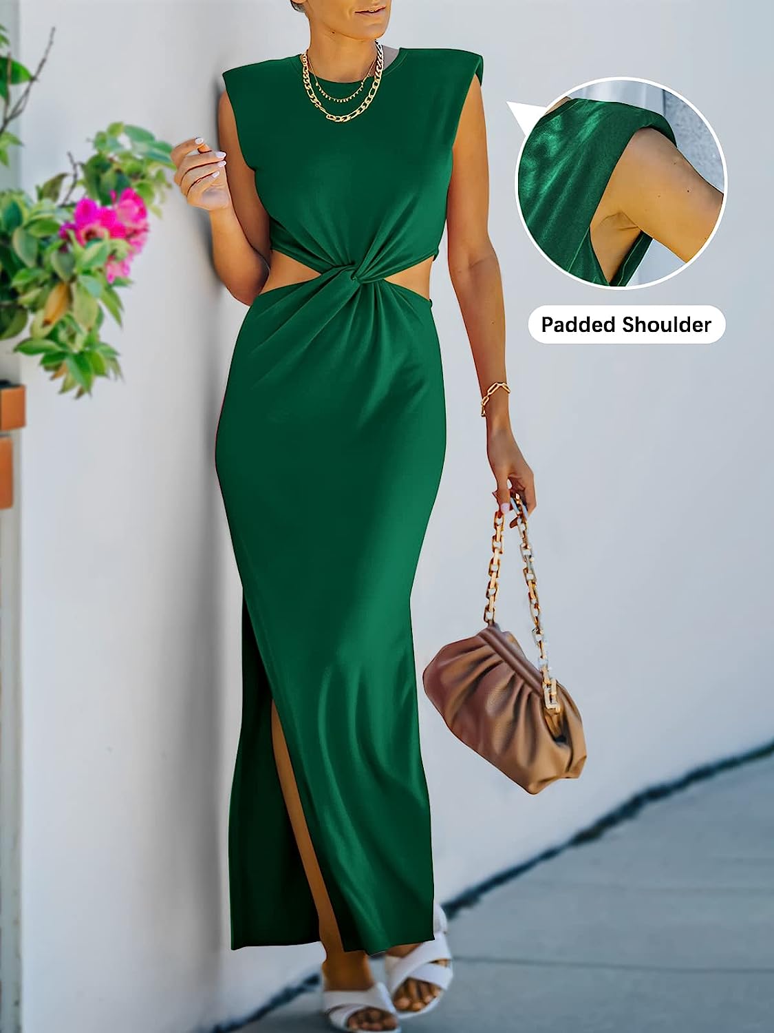 ANRABESS Women Summer Sleeveless Padded Shoulder Sexy Cutout Waist Bodycon Formal Party Maxi Dress with Slit for Cruise Beach(Forest)