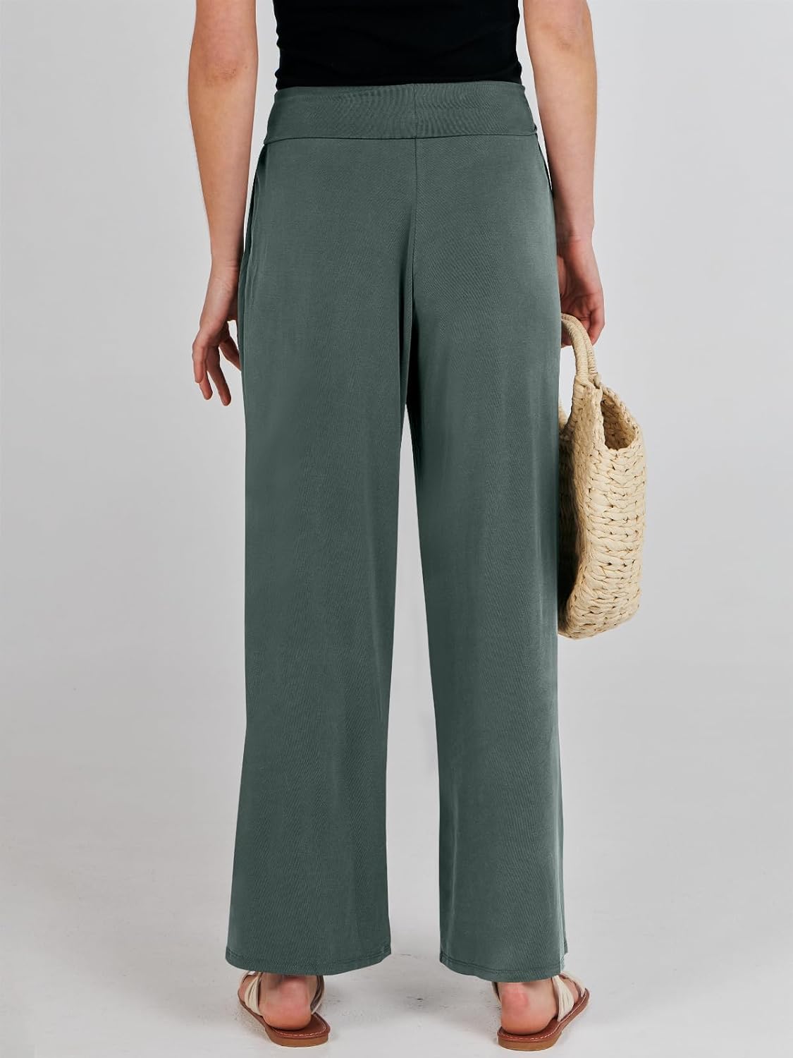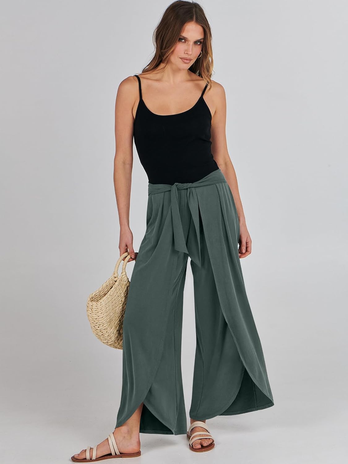 ANRABESS Women Summer Wide Leg Pants Tie Front Loose Flowy High Waisted Casual Slit Boho Lounge Palazzo Pants Trousers(Deep Green)
