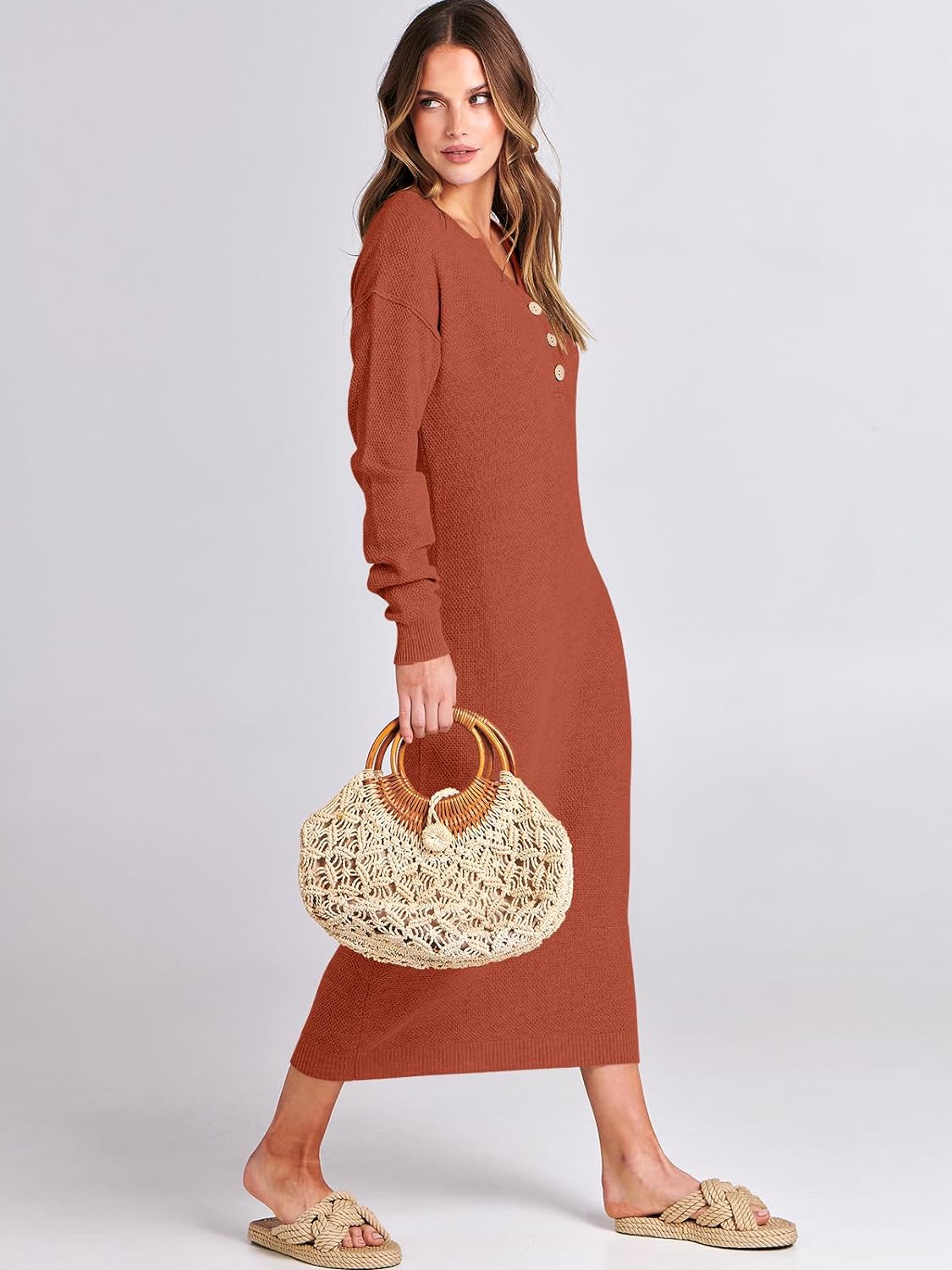 Design – Women's sweater maxi dress is crafted with premium waffle knit fabric that feels warm and gentle against the skin, Its button-up V-neckline and roomy yet flattering oversized make it a chic and effortless choice for any occasion. this sweater maxi dress it's a wardrobe essential that embodies both comfort and fashion-forward style.