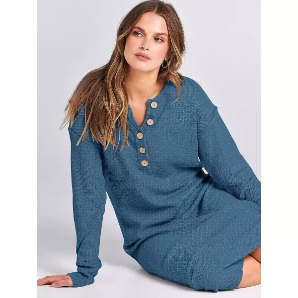 ANRABESS Women Sweater Dress Long Sleeve Button V Neck Oversized Casual Loose Fall Waffle Knit Long Dress(Dusty Blue)
