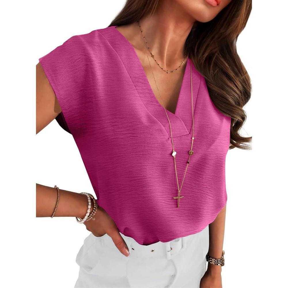 ANRABESS Women Tops Cap Sleeve Textured Dressy Casual V Neck Shirts 2026 Summer Business Work Blouses Outfits(Hot Pink)