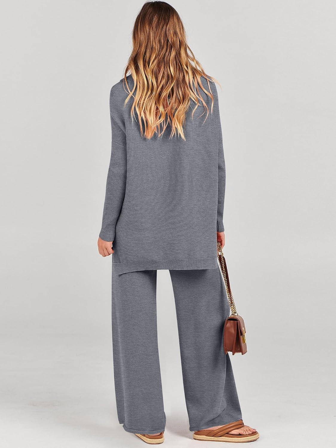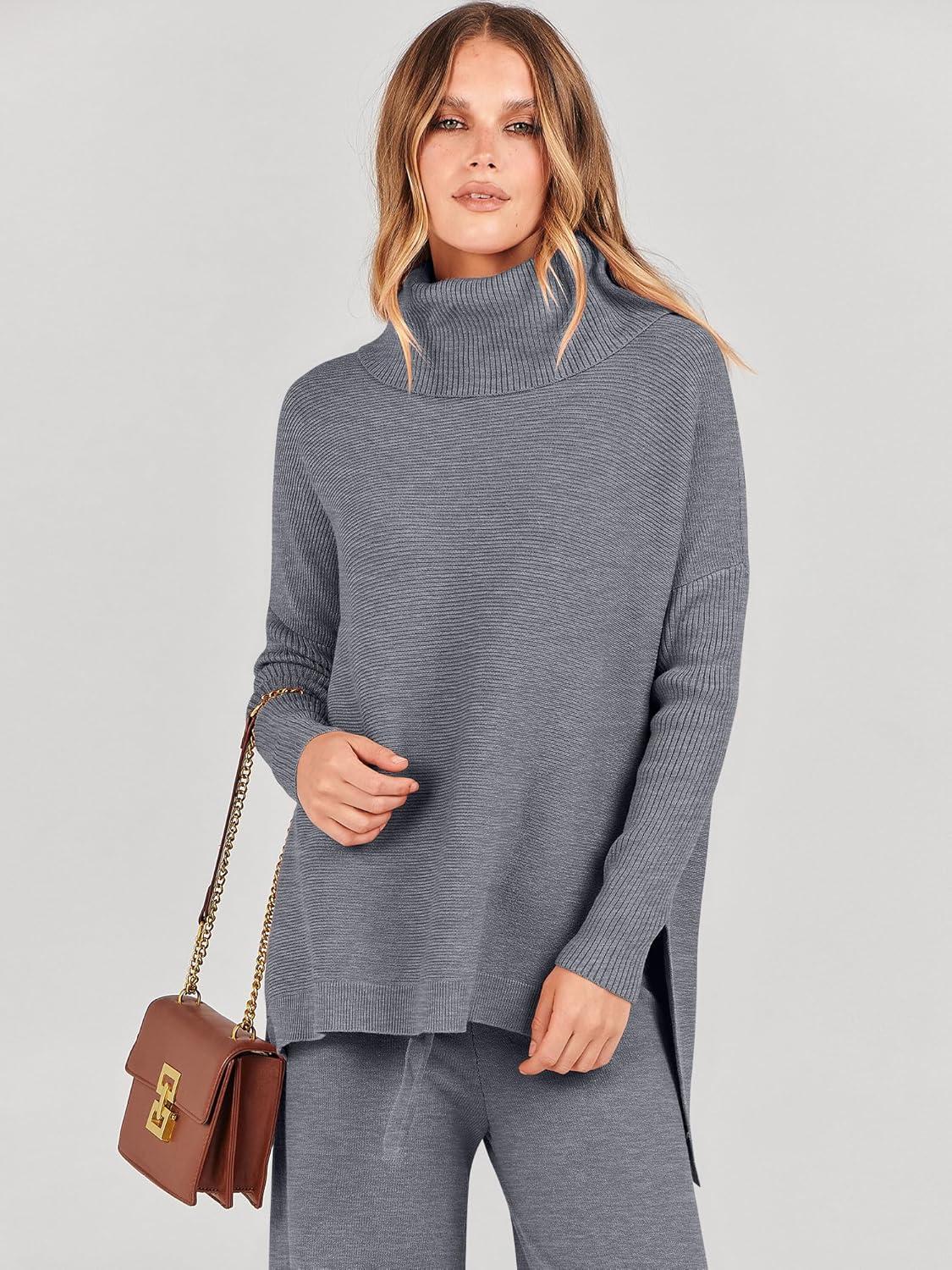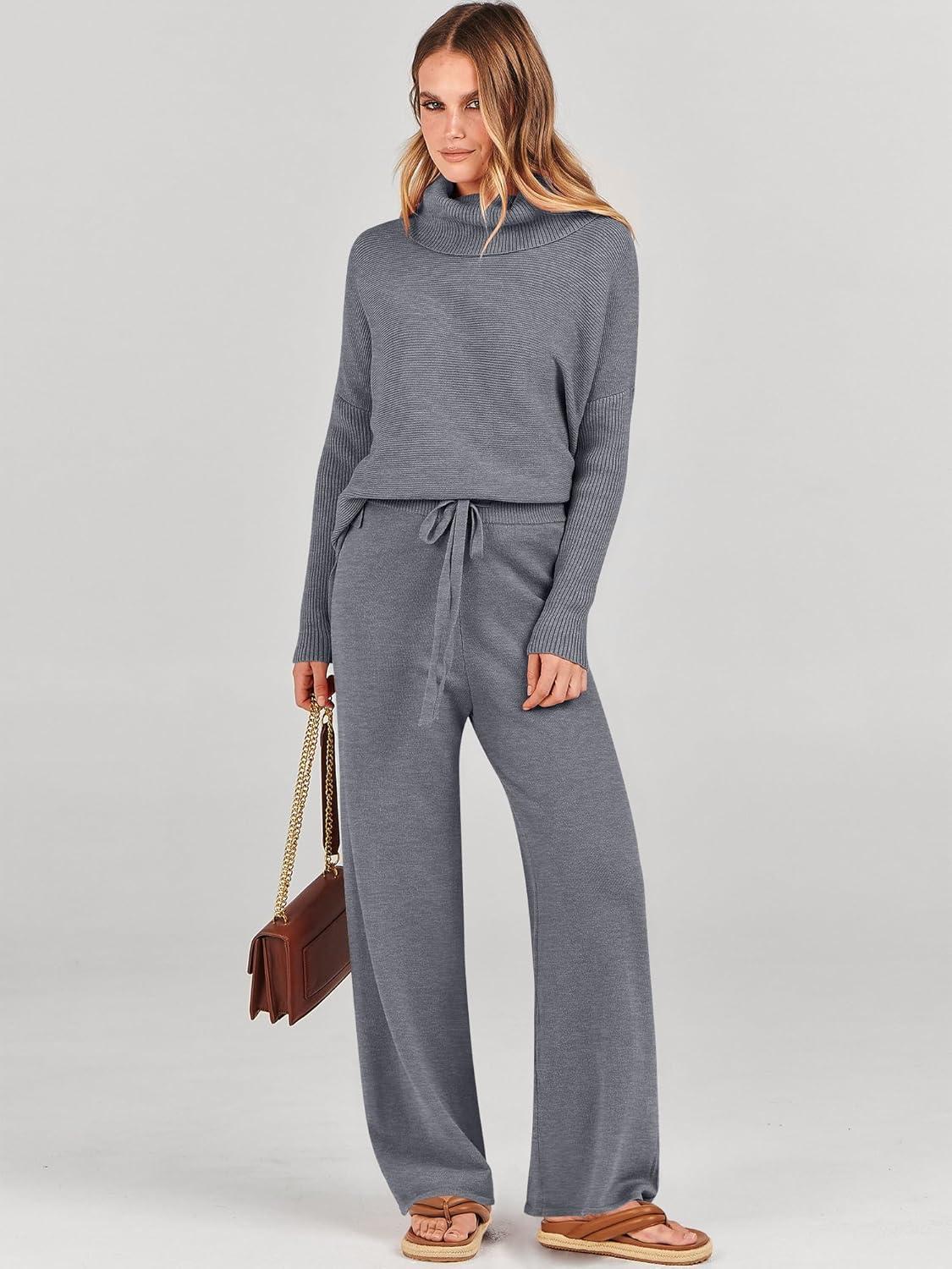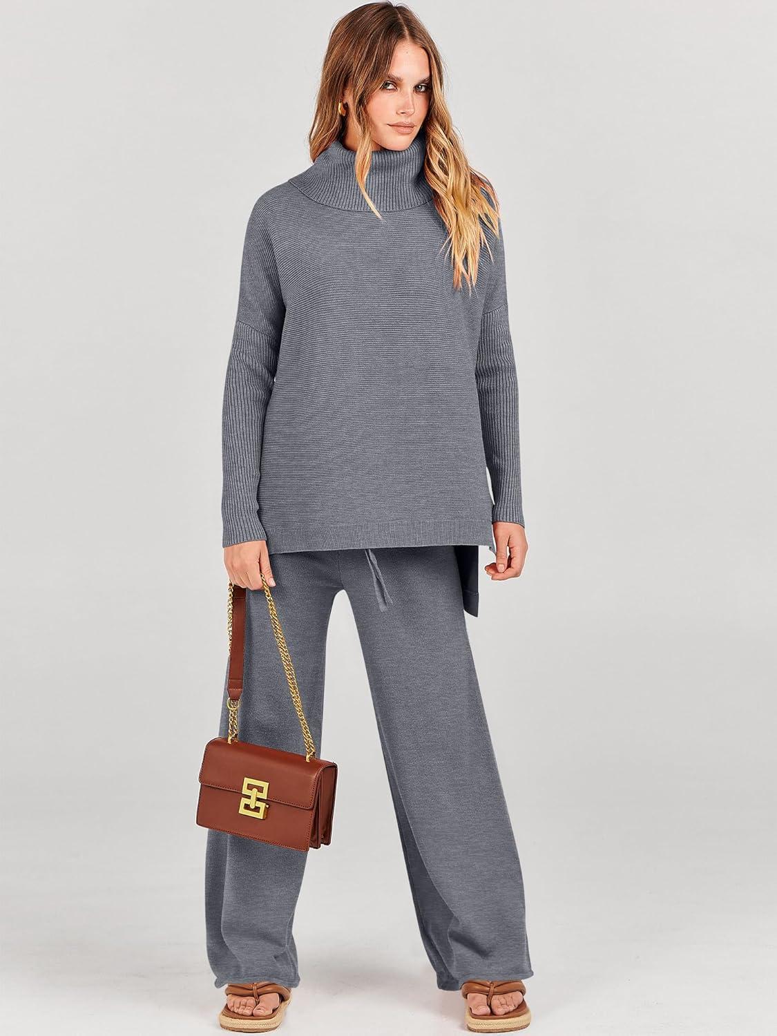 ANRABESS Women Two Piece Outfits Oversized Turtleneck Knit Pullover Sweater Top Wide Leg Pants Lounge Set Sweatsuit 2025 Fall(Dark Grey)