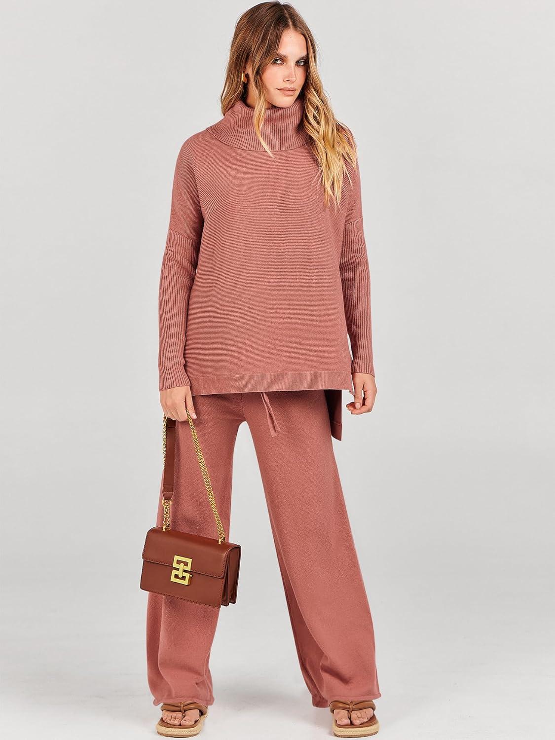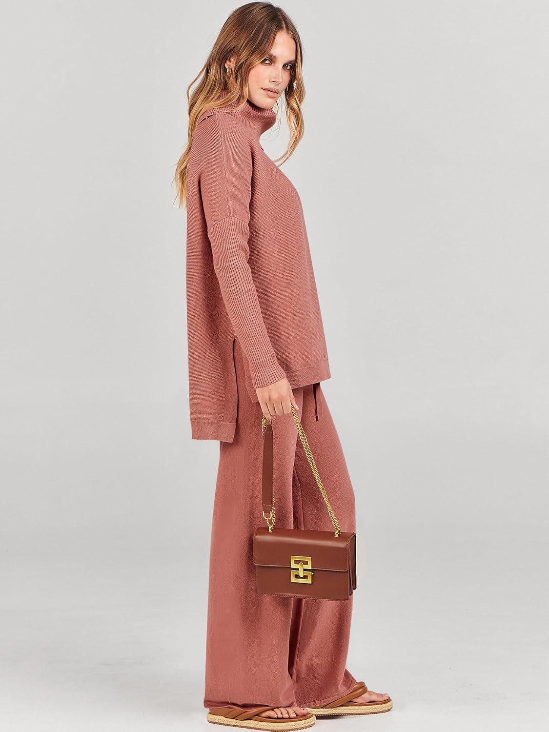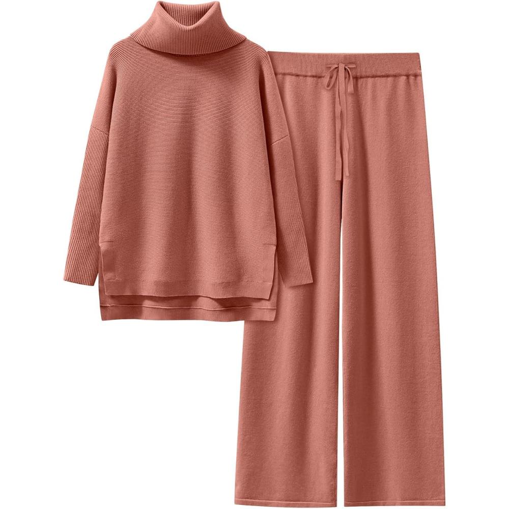 ANRABESS Women Two Piece Outfits Oversized Turtleneck Knit Pullover Sweater Top Wide Leg Pants Lounge Set Sweatsuit 2025 Fall(Rust)