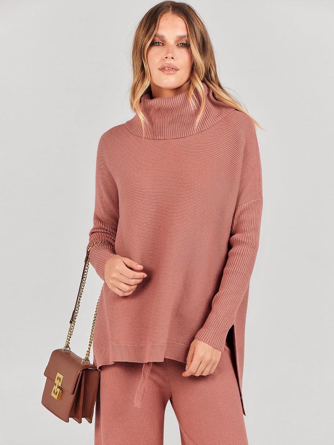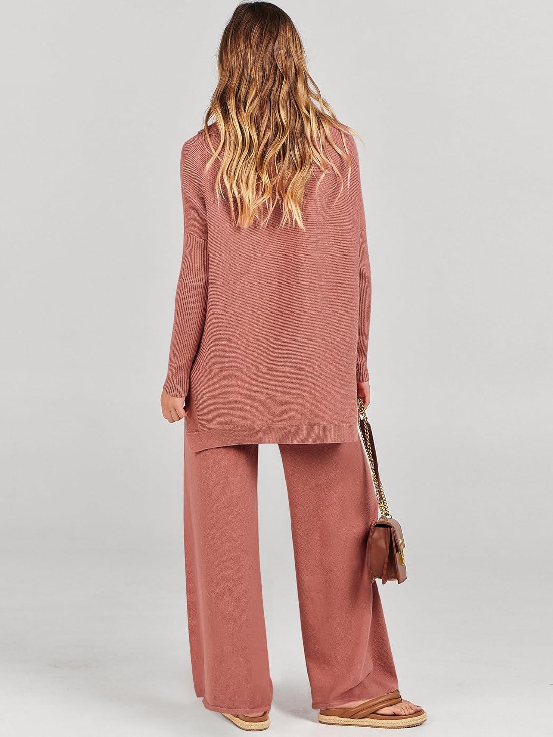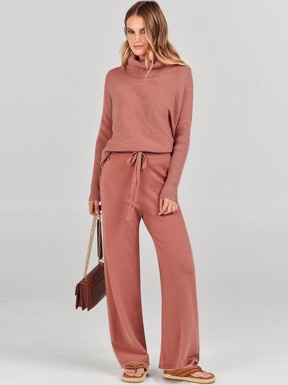 ANRABESS Women Two Piece Outfits Oversized Turtleneck Knit Pullover Sweater Top Wide Leg Pants Lounge Set Sweatsuit 2025 Fall(Rust)
