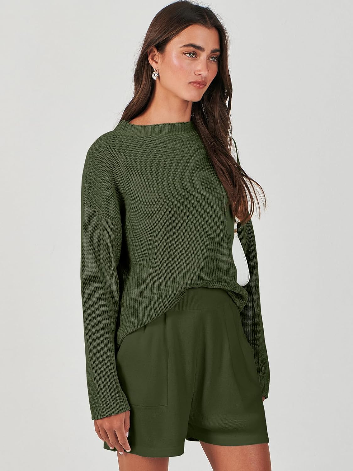 ANRABESS Women Two Piece Outfits Sweater Sets Knit Pullover Long Sleeves Tops and Shorts Sweatsuit Lounge Set Tracksuit(Army Green)