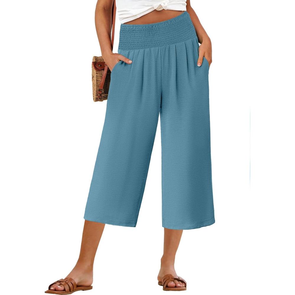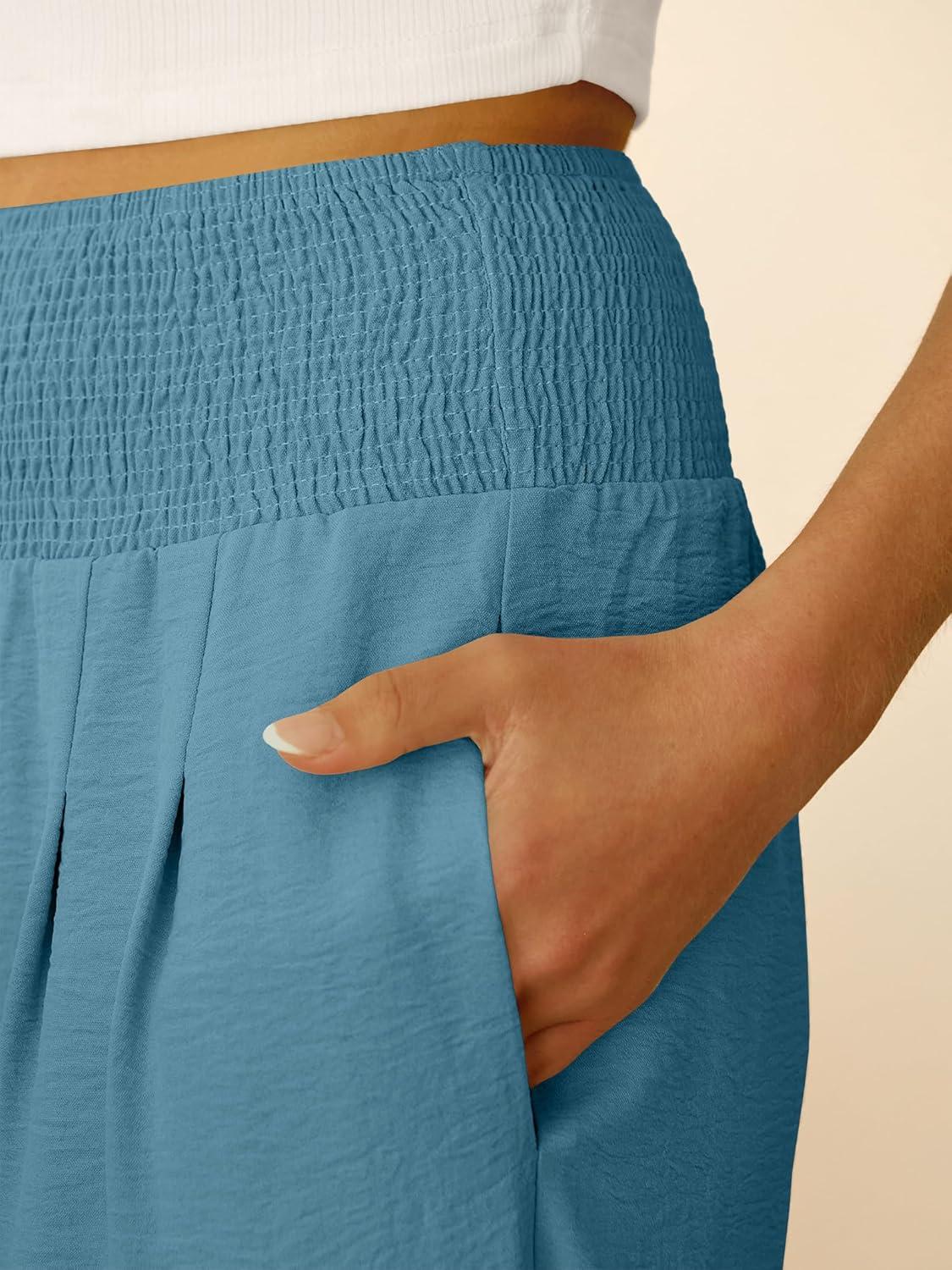 ANRABESS Women Wide Leg Palazzo Capri Pants High Waisted Smocked Lounge Trousers 2026 Summer Loose Flowy Casual Beach Outfits(Lake)