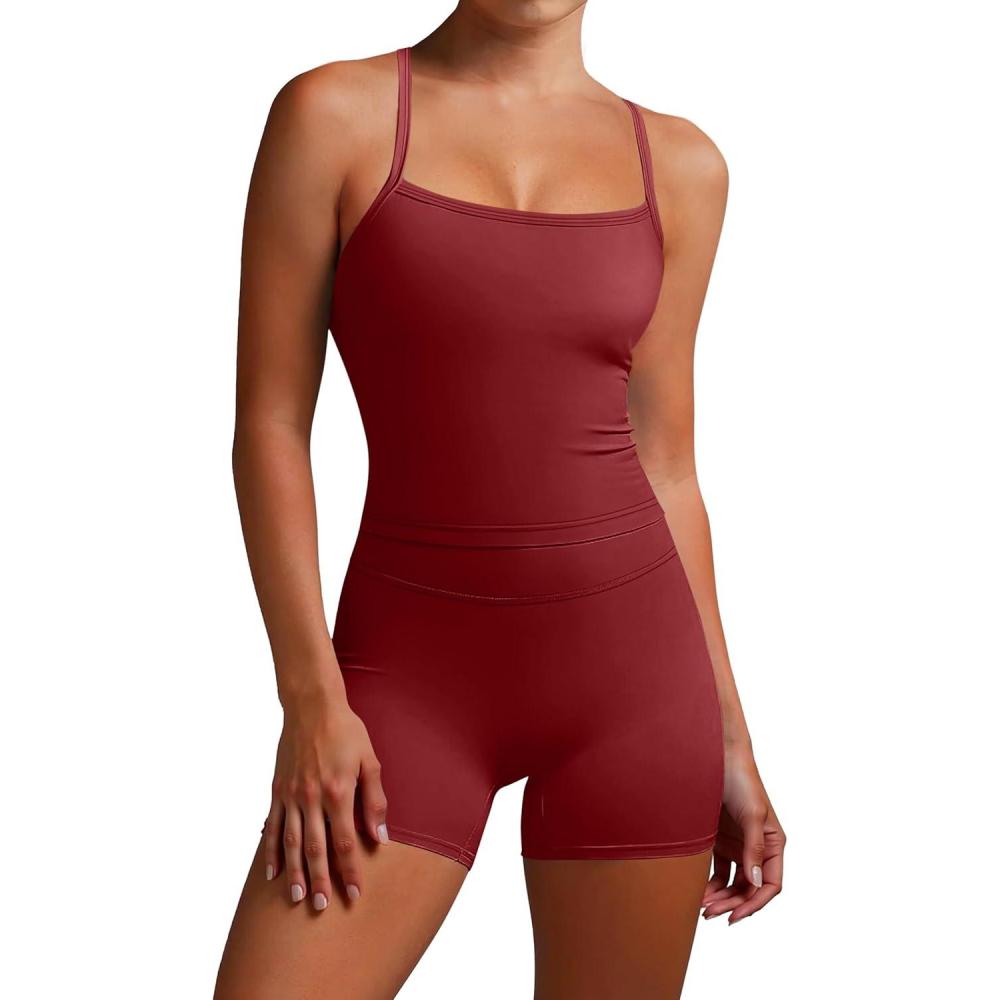 imageANRABESS Women Workout Sets Build in Bra 2 Piece Outfits Tank Tops Tummy Control Shorts Yoga Gym Active Wear Clothing SetDeep Red