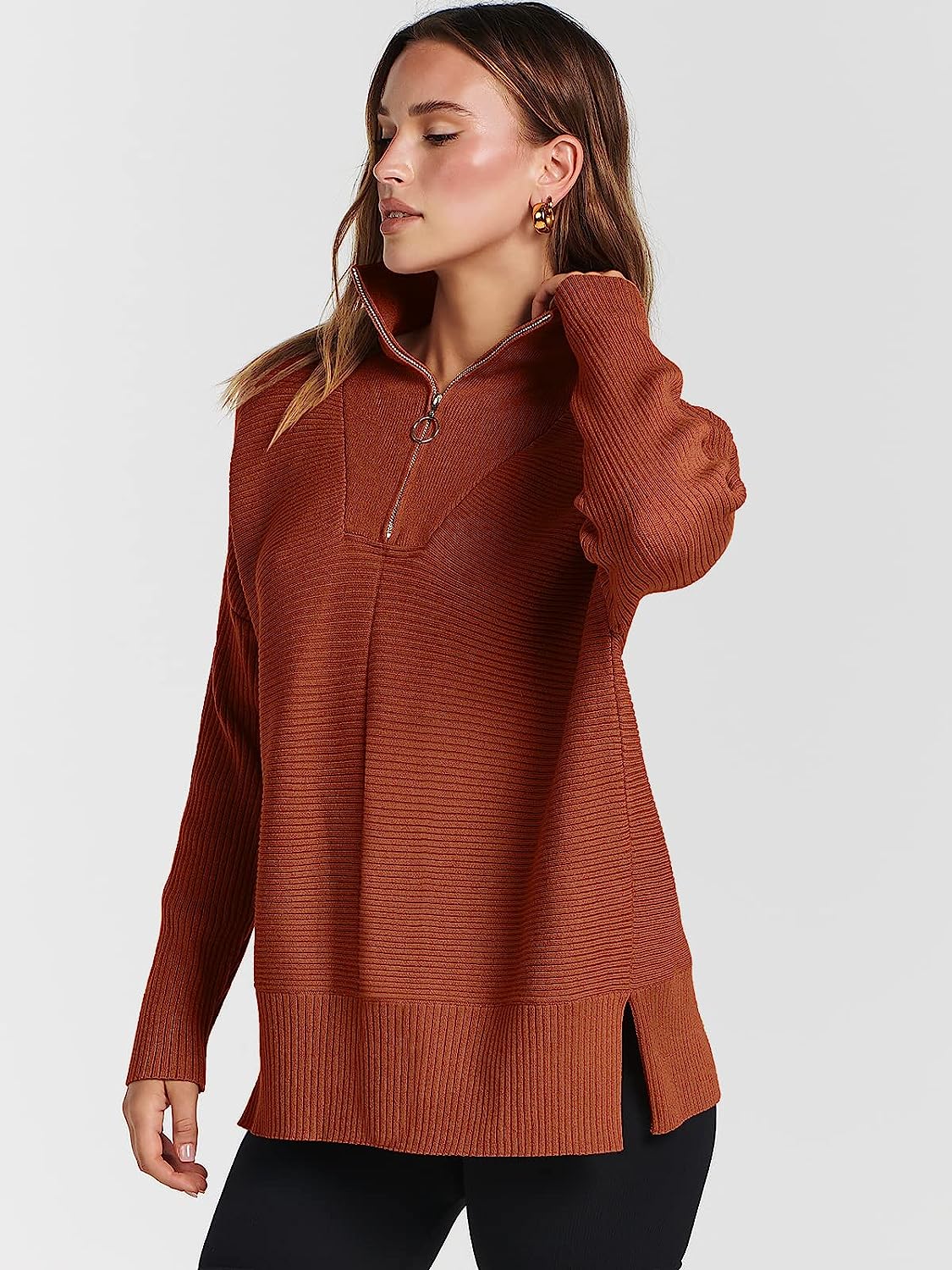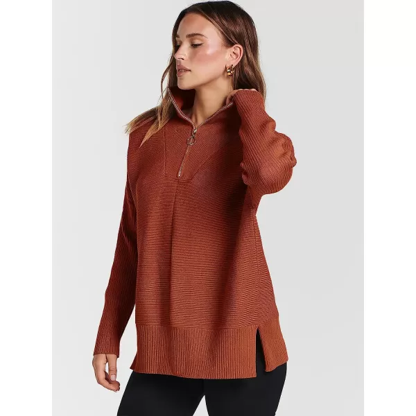 ANRABESS Womens 1/4 Zipper Long Sleeve V Neck Collar Casual Oversized Ribbed Knit Pullover Tunic Sweater with Slit(Rust)