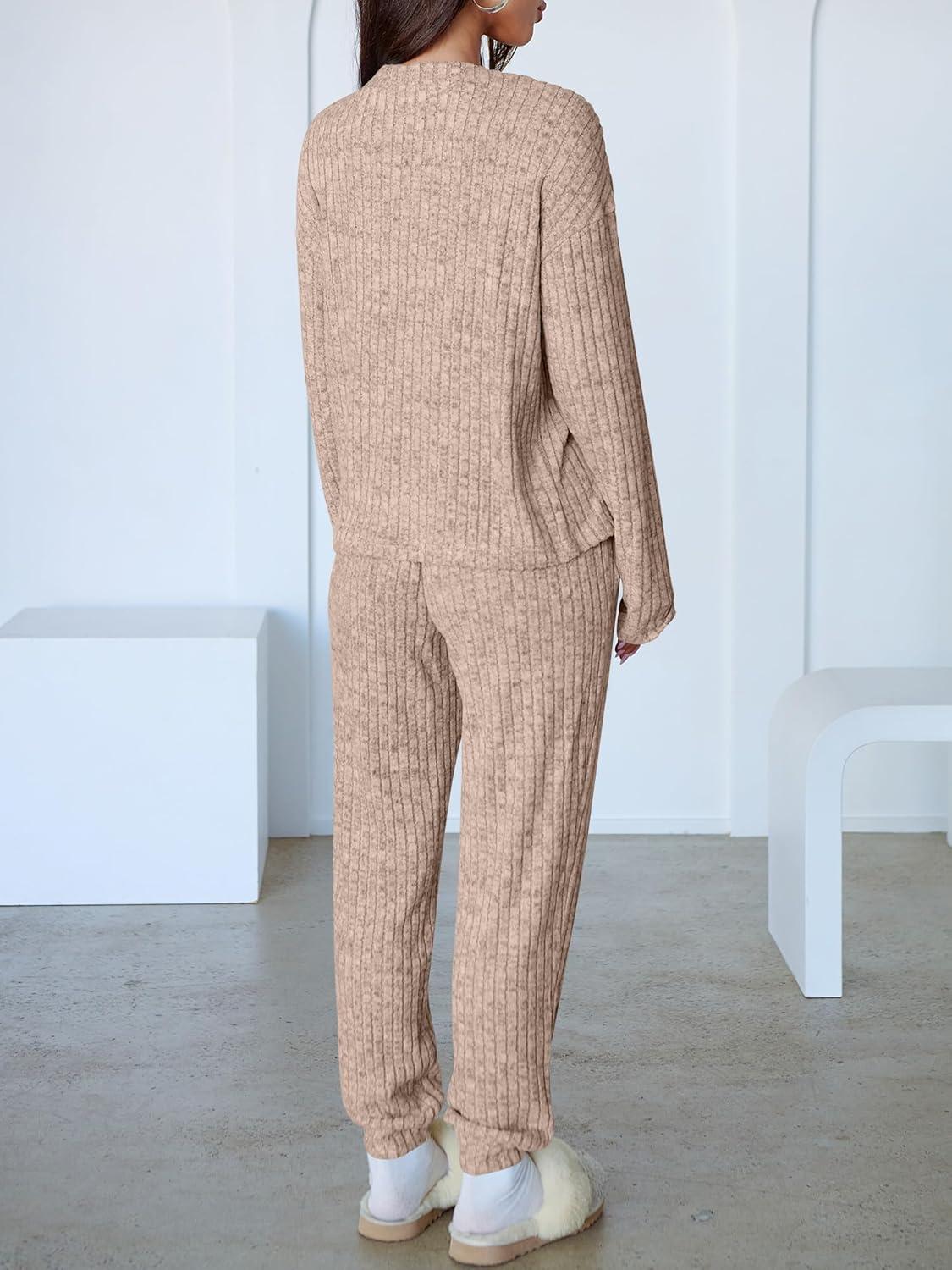 imageANRABESS Womens 2 Piece Lounge Pajama Sets Casual Ribbed Knit V Neck Long Sleeve Jogger Pants Matching Set 2025 Fall OutfitsLight Khaki