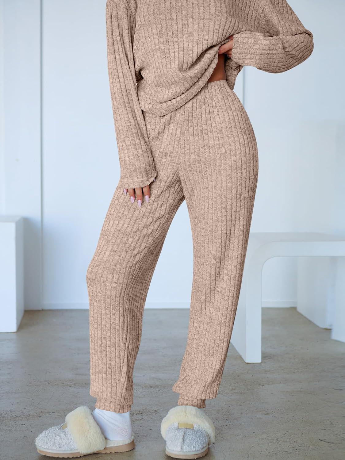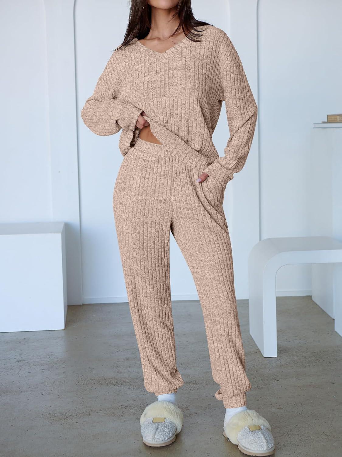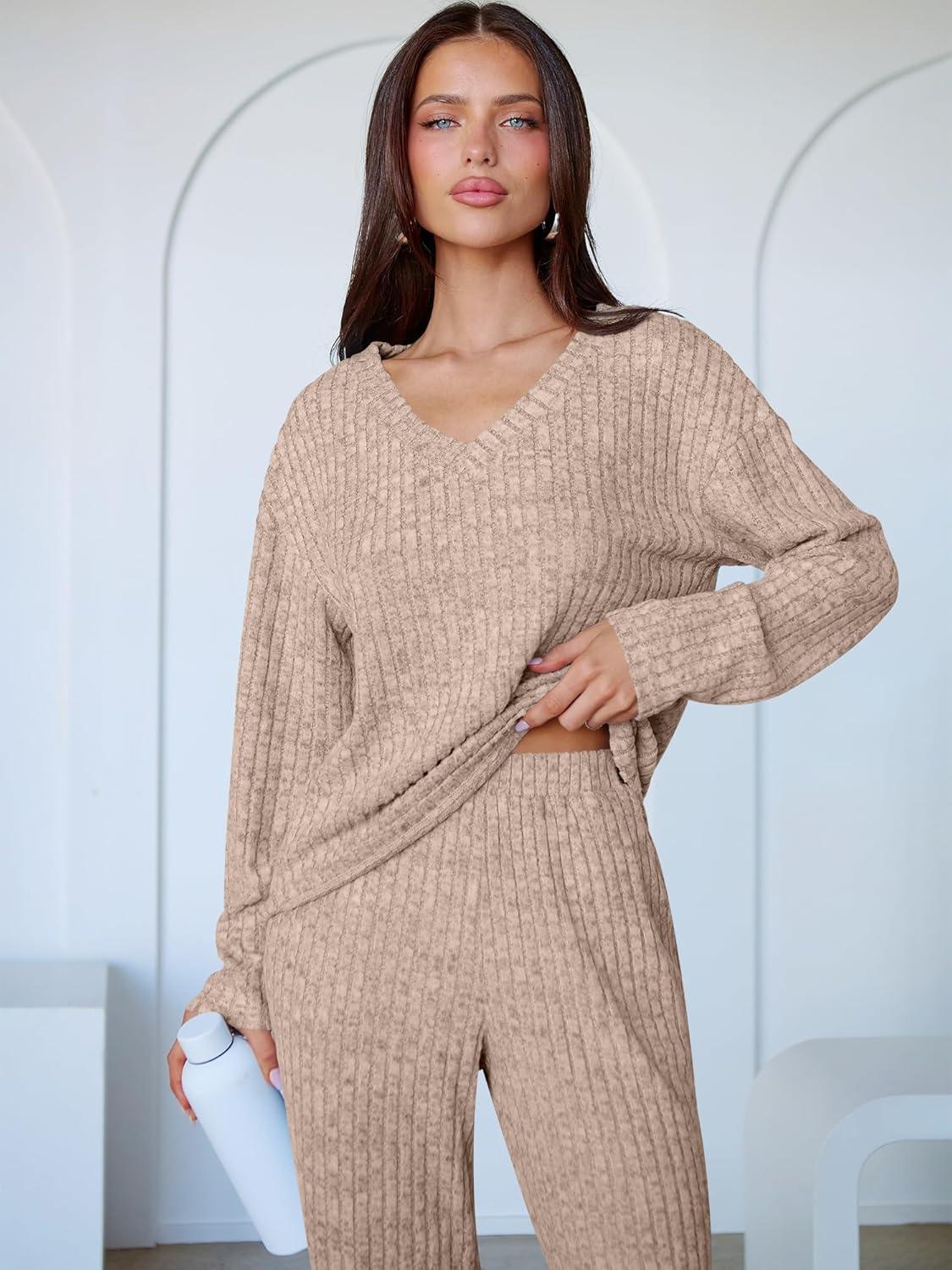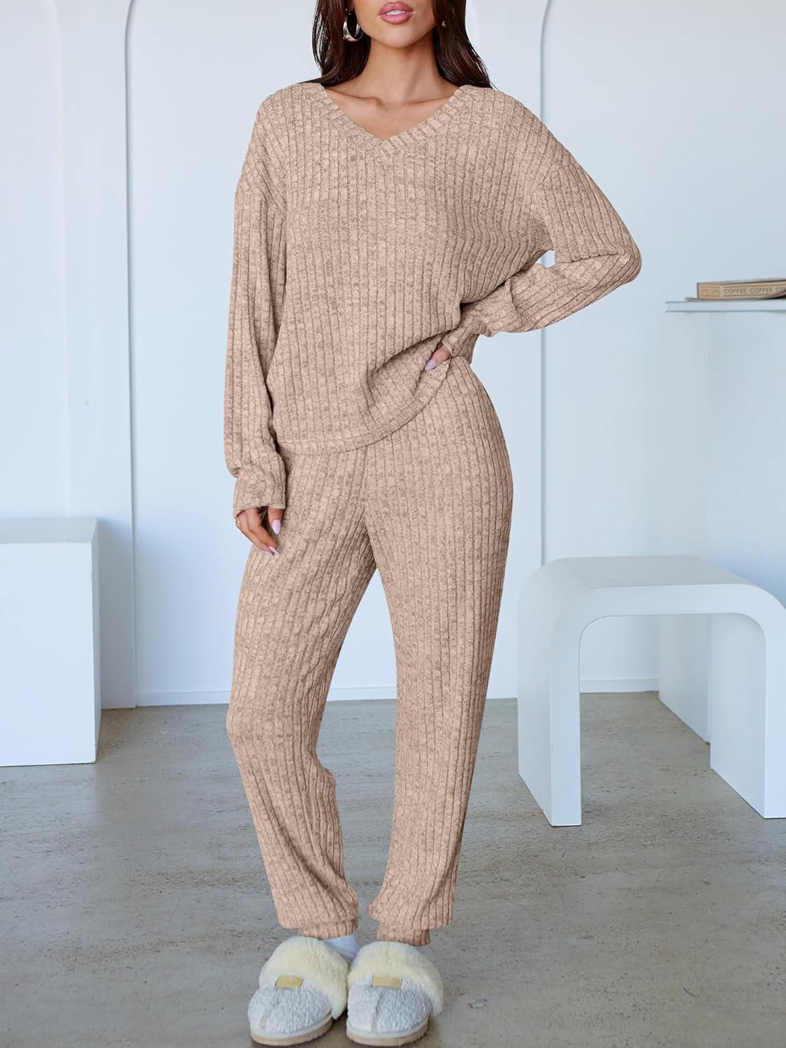 ANRABESS Women’s 2 Piece Lounge Pajama Sets Casual Ribbed Knit V Neck Long Sleeve Jogger Pants Matching Set 2025 Fall Outfits(Light Khaki)
