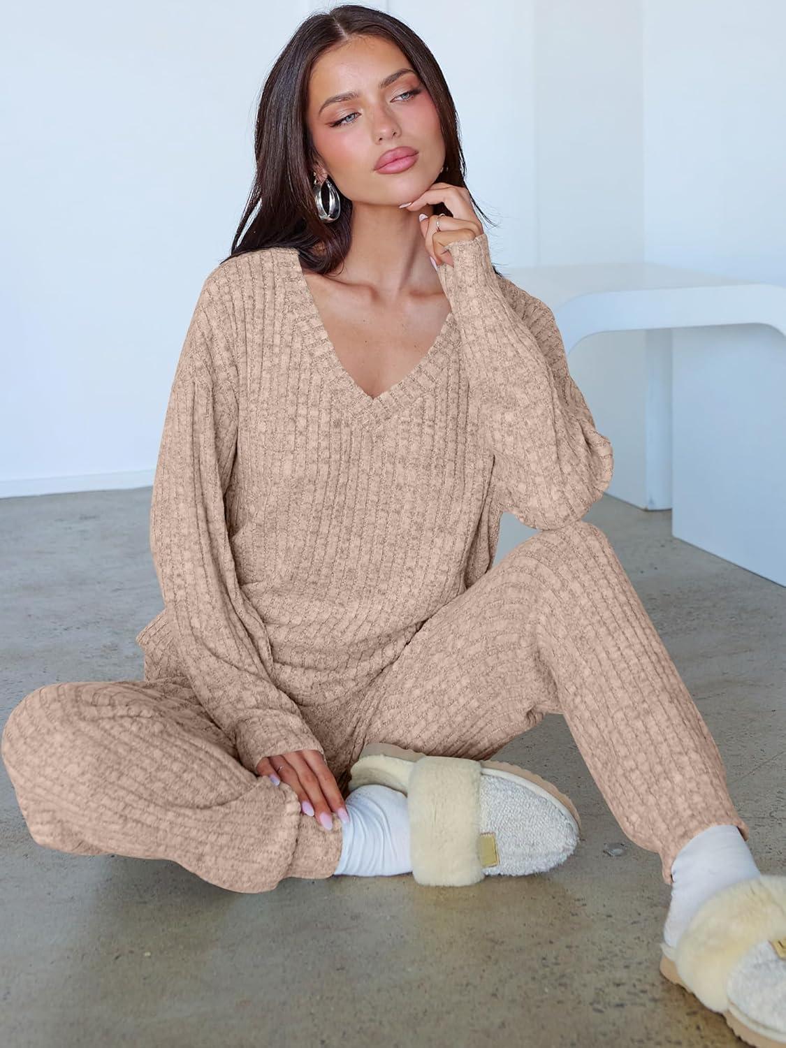 ANRABESS Women’s 2 Piece Lounge Pajama Sets Casual Ribbed Knit V Neck Long Sleeve Jogger Pants Matching Set 2025 Fall Outfits(Khaki)