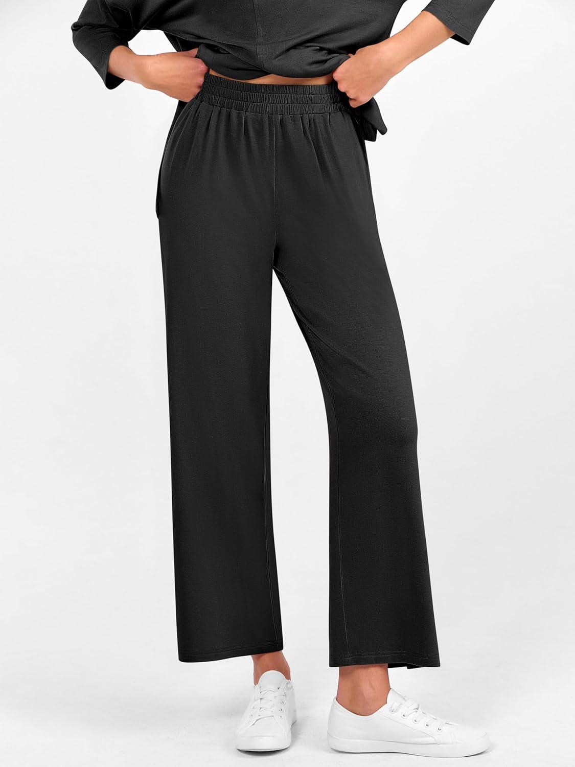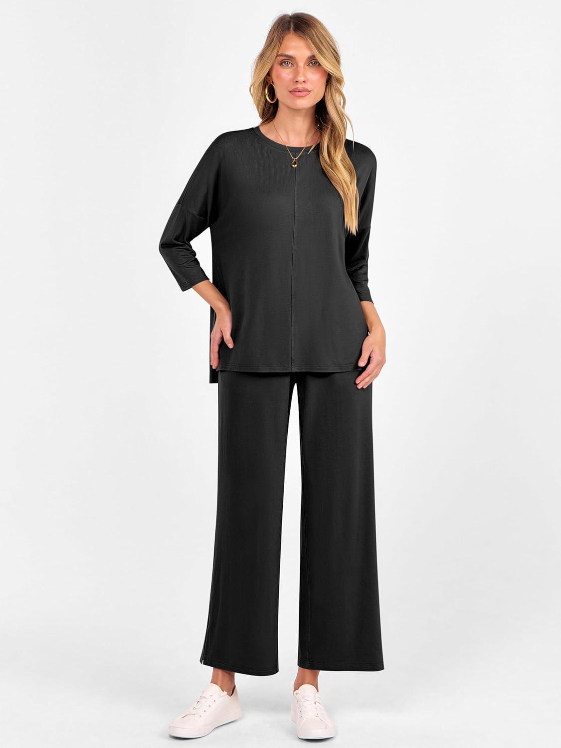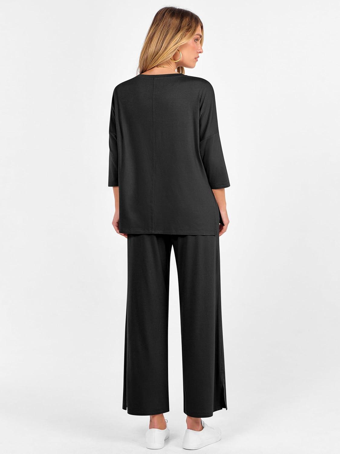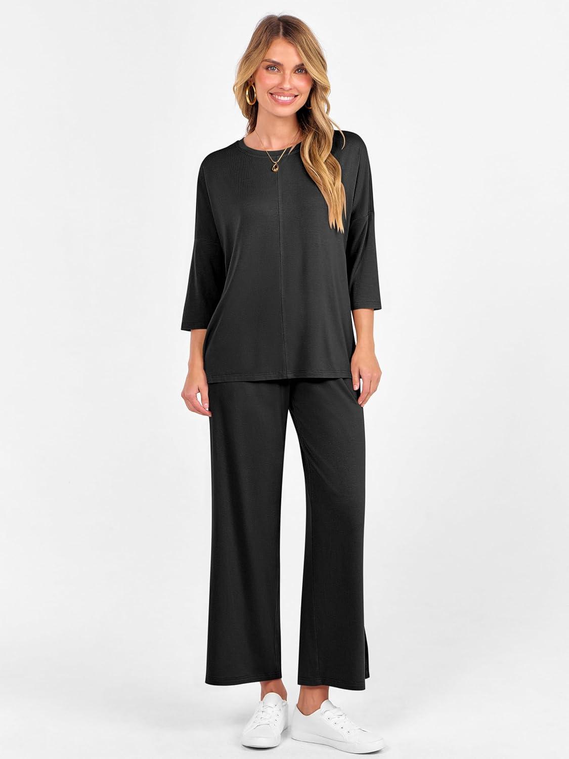 ANRABESS Women's 2 Piece Outfits 3/4 Sleeve Loose Tops Wide leg Pants Lounge Pajama Set Casual Travel Loungewear Clothes(Black)