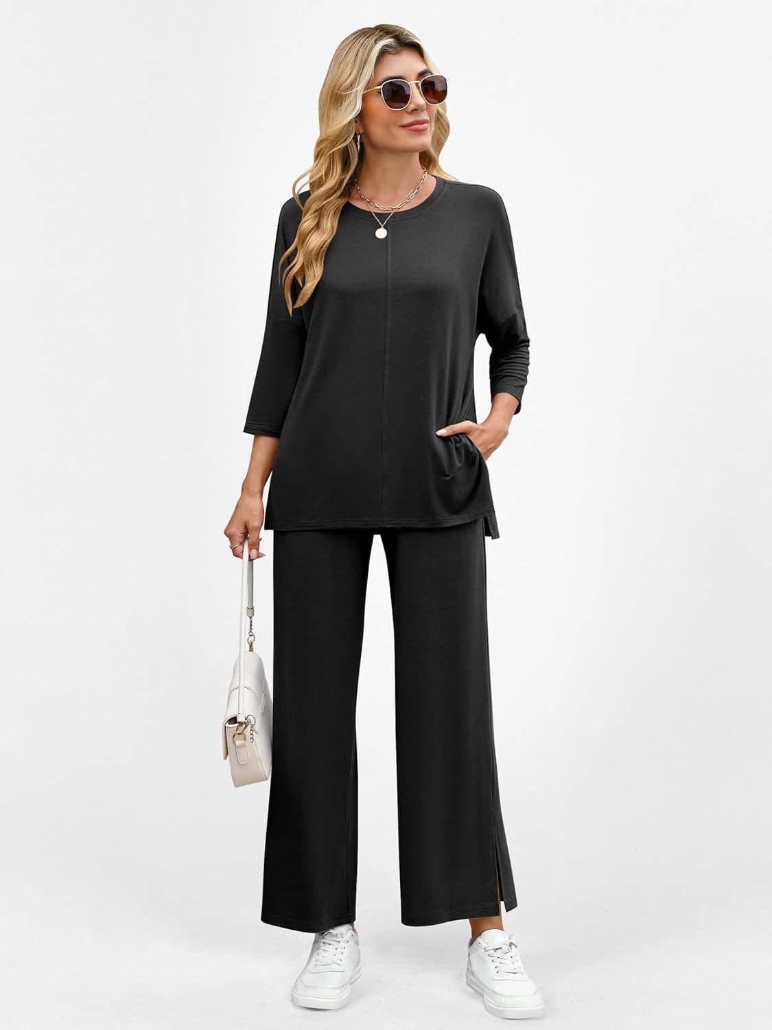 imageANRABESS Womens 2 Piece Outfits 34 Sleeve Loose Tops Wide leg Pants Lounge Pajama Set Casual Travel Loungewear ClothesBlack