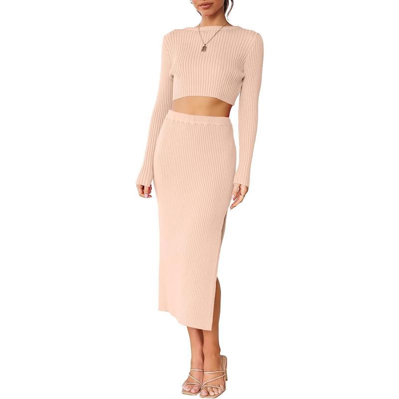 Features – this sweater dress made 2 piece long sleeve round neck crop top and slit side skirt,warm sweater ribbed knit fabric perfect for fall and winter.