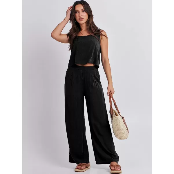 ANRABESS Women's 2 Piece Outfits Square Neck Linen Tank Crop Top Wide Leg Pants Matching Lounge Set Tracksuit(Black)