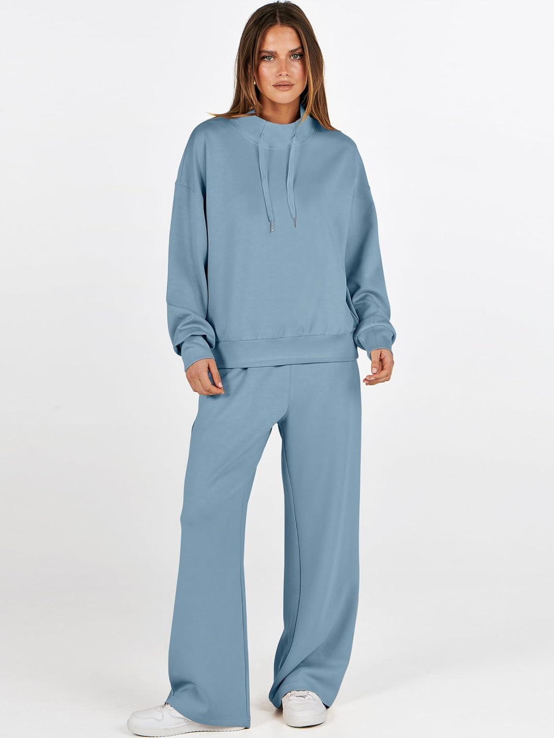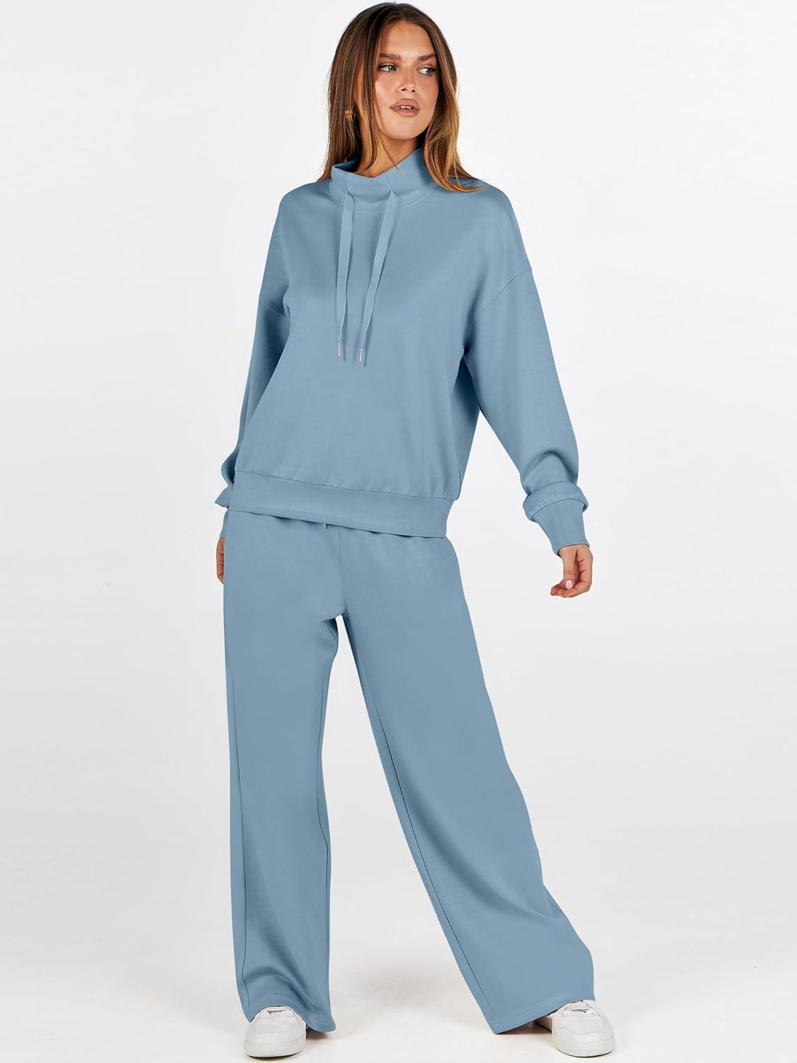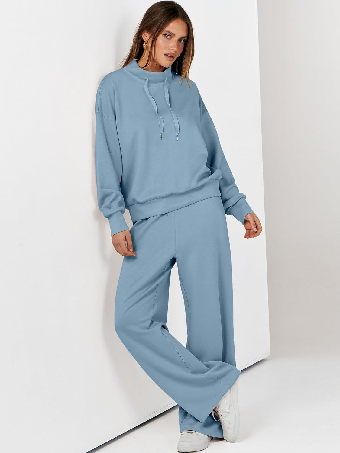 ANRABESS Womens 2 Piece Outfits Sweatsuit Set 2025 Fall Drawstring Sweatshirt Wide Leg Sweatpant Lounge Set Tracksuit(Light Blue)