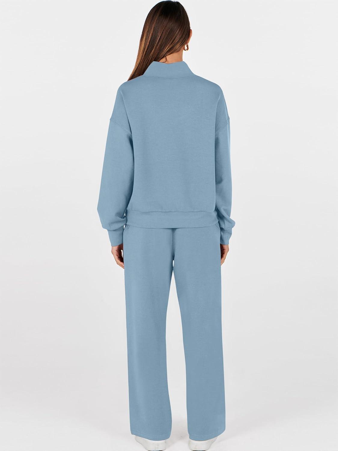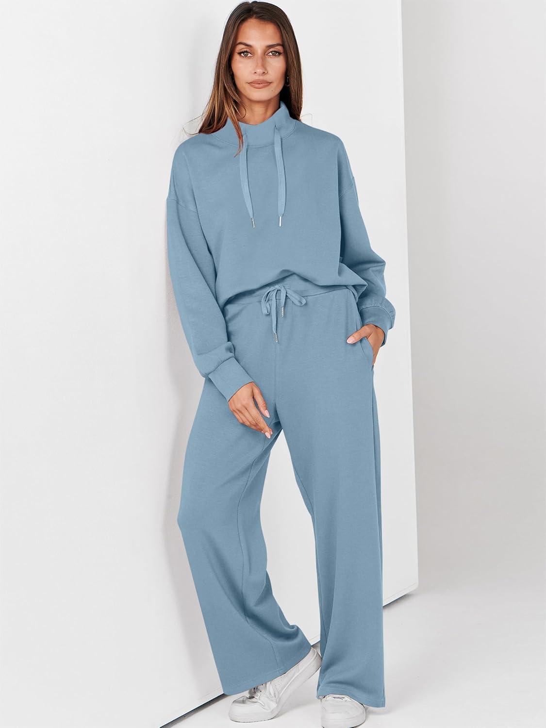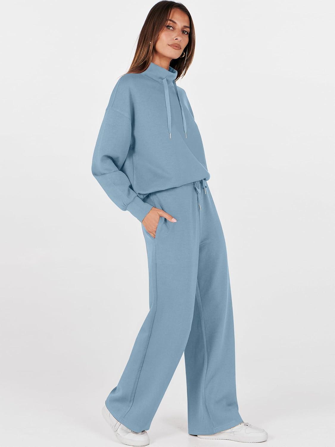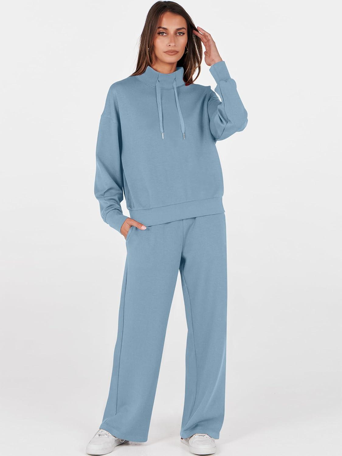 ANRABESS Womens 2 Piece Outfits Sweatsuit Set 2025 Fall Drawstring Sweatshirt Wide Leg Sweatpant Lounge Set Tracksuit(Light Blue)