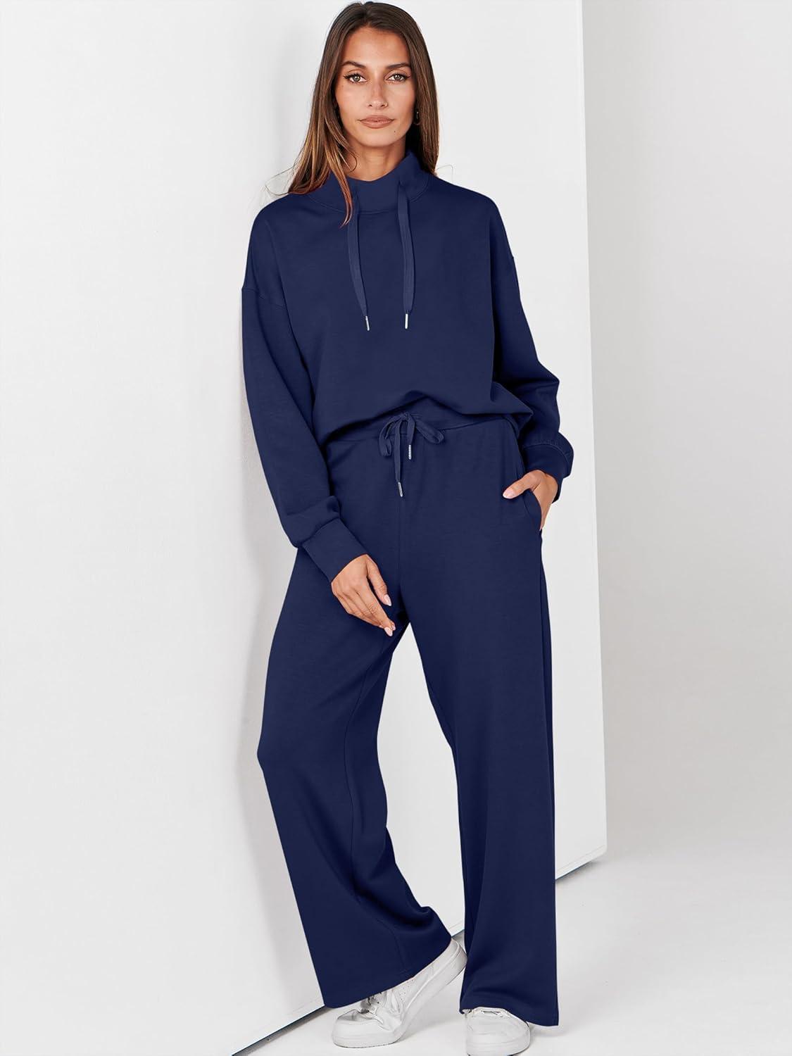 ANRABESS Womens 2 Piece Outfits Sweatsuit Set 2025 Fall Drawstring Sweatshirt Wide Leg Sweatpant Lounge Set Tracksuit(Navy Blue)