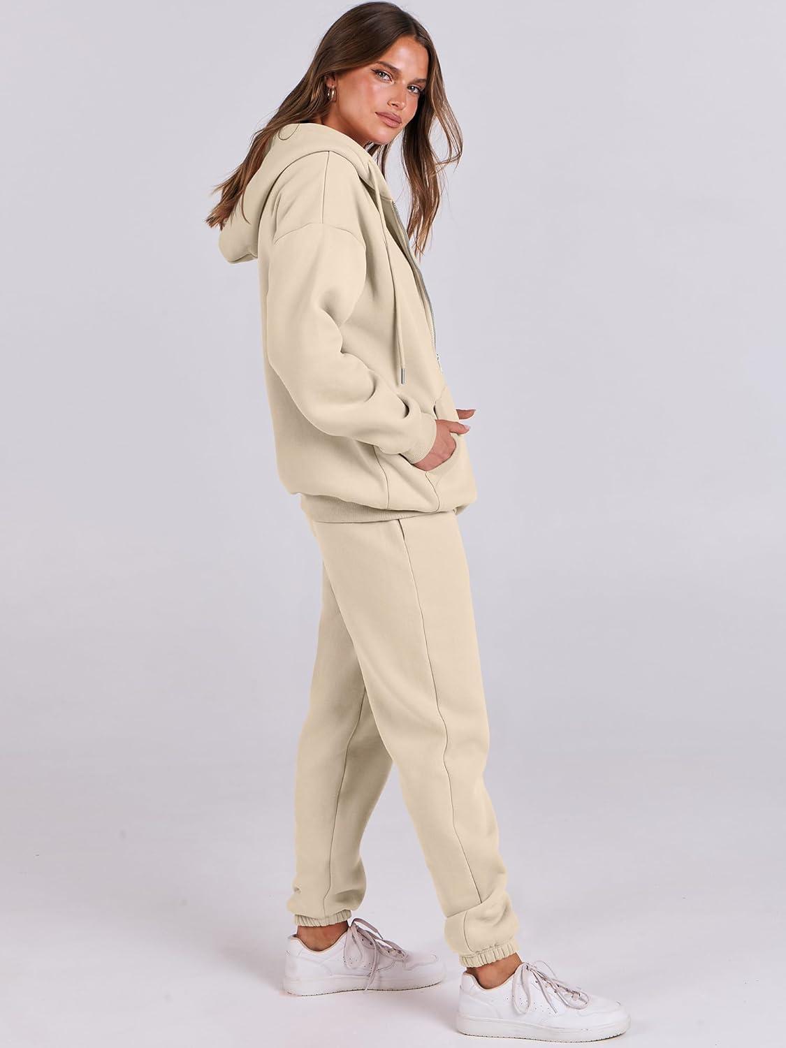 ANRABESS Womens 2 Piece Outfits Sweatsuits Oversized Zip Up Sweatshirt Jogger Sweatpants Tracksuit Sweat Lounge Matching Set(Beige)