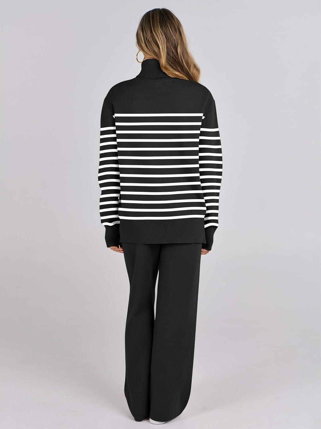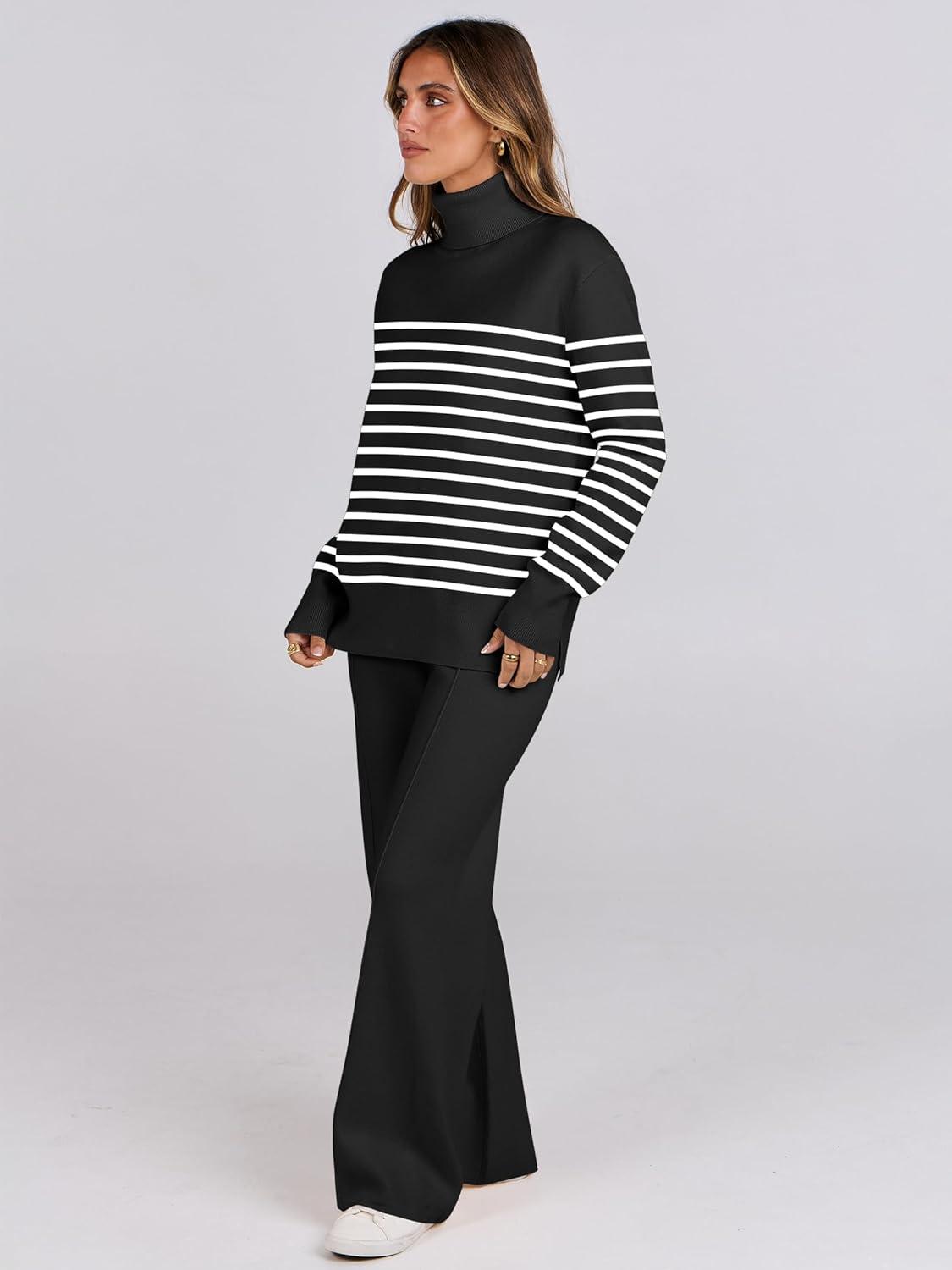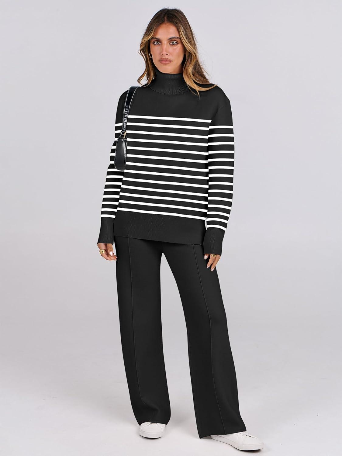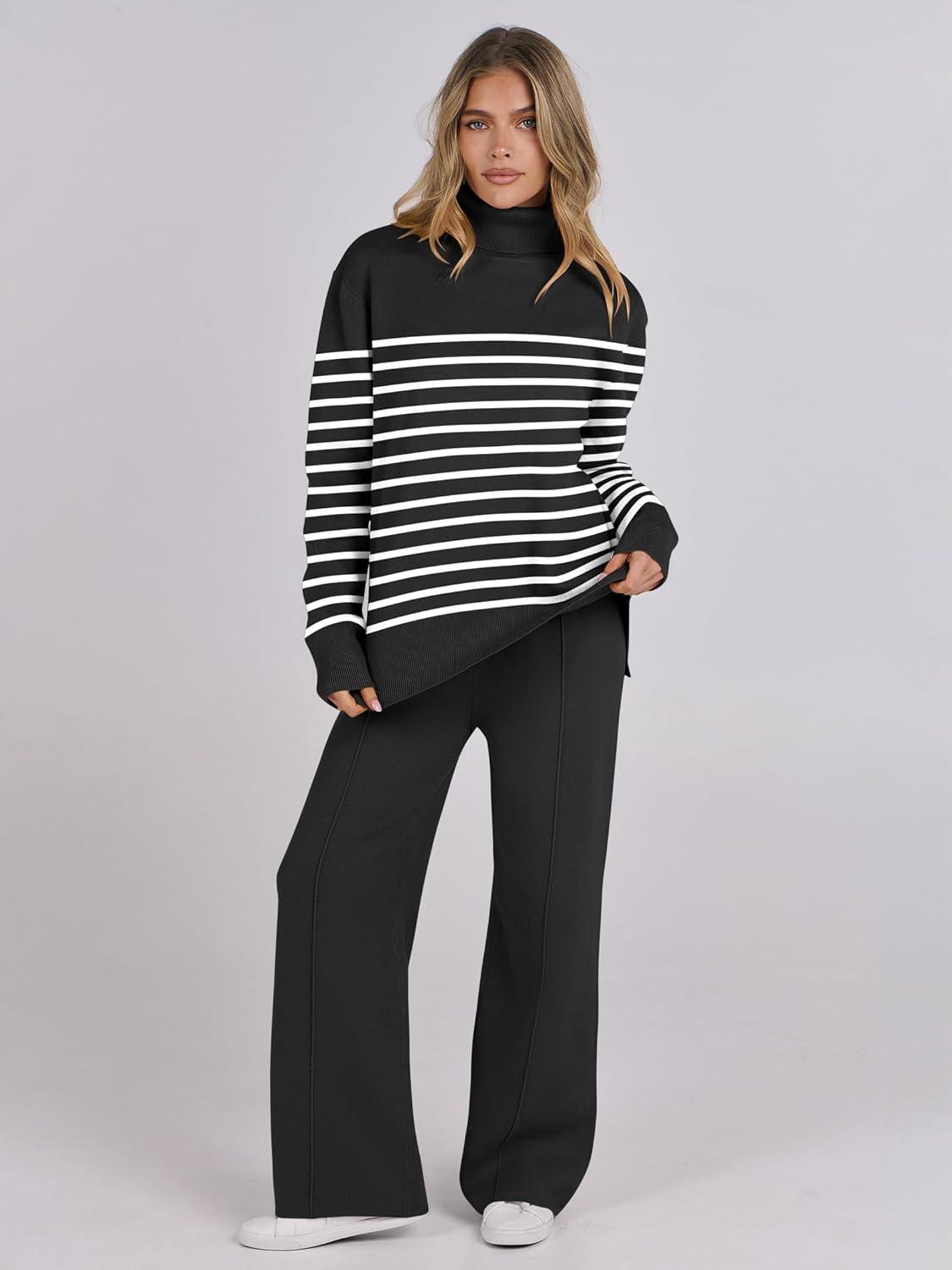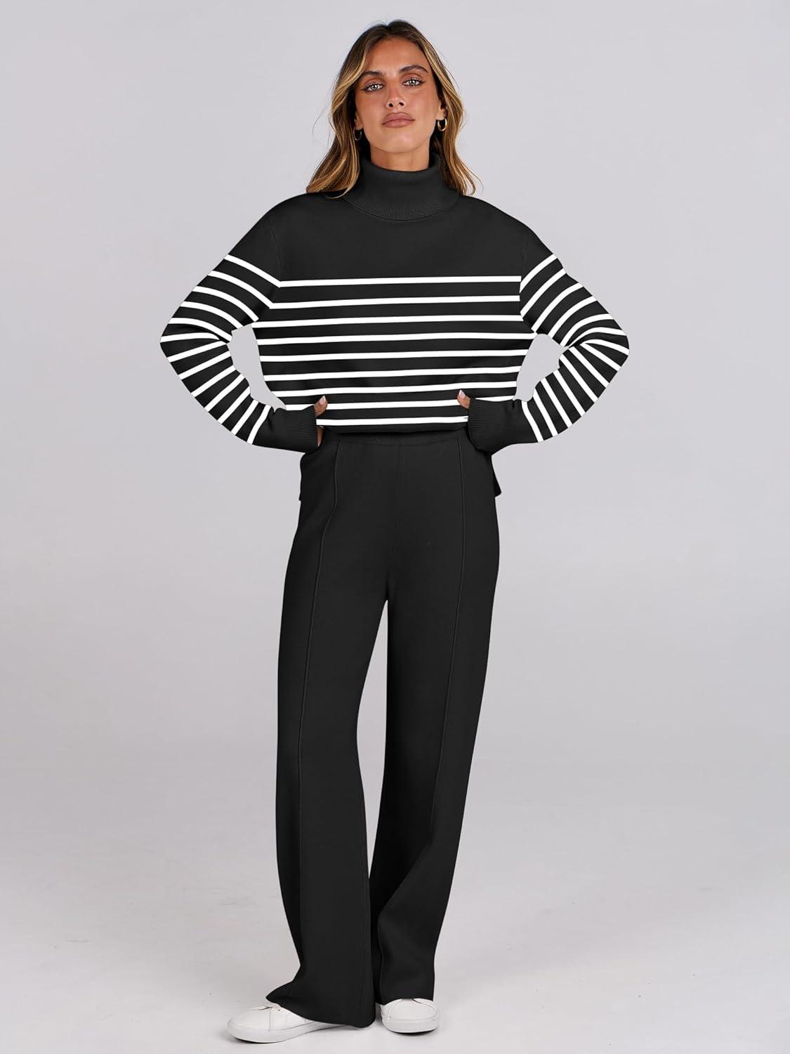 ANRABESS Womens 2 Piece Outfits Turtleneck Matching Lounge Set Sweater Top Wide Leg Pants Fall Cozy Knit Sweatsuit Loungewear(Black White Stripe)