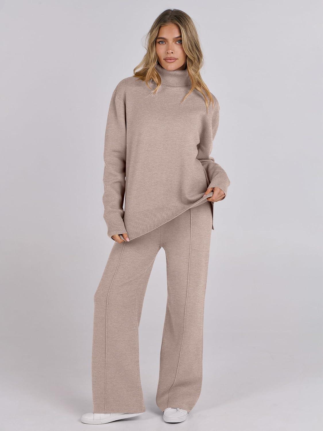 imageANRABESS Womens 2 Piece Outfits Turtleneck Matching Lounge Set Sweater Top Wide Leg Pants Fall Cozy Knit Sweatsuit LoungewearCamel