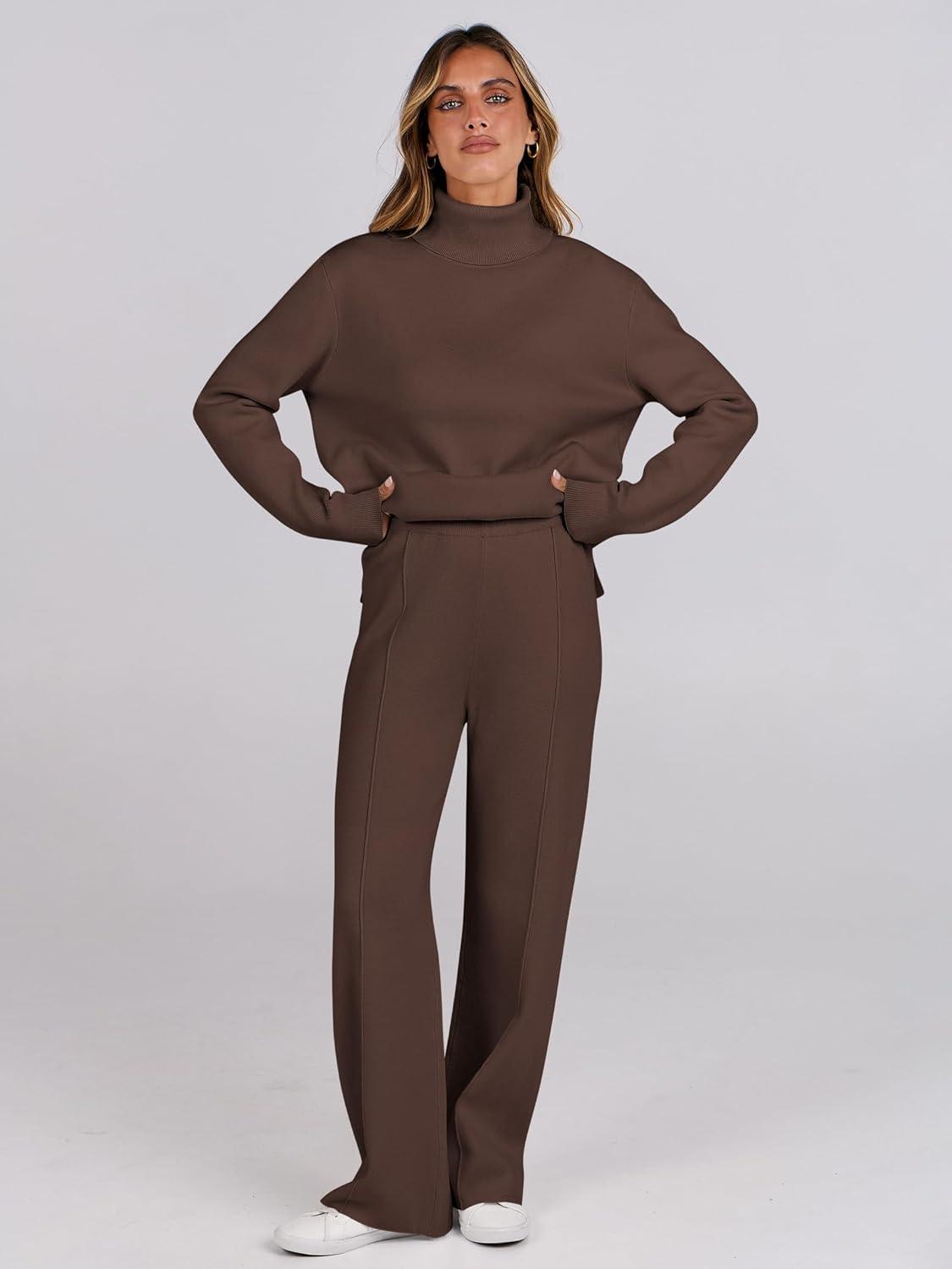 imageANRABESS Womens 2 Piece Outfits Turtleneck Matching Lounge Set Sweater Top Wide Leg Pants Fall Cozy Knit Sweatsuit LoungewearCoffee
